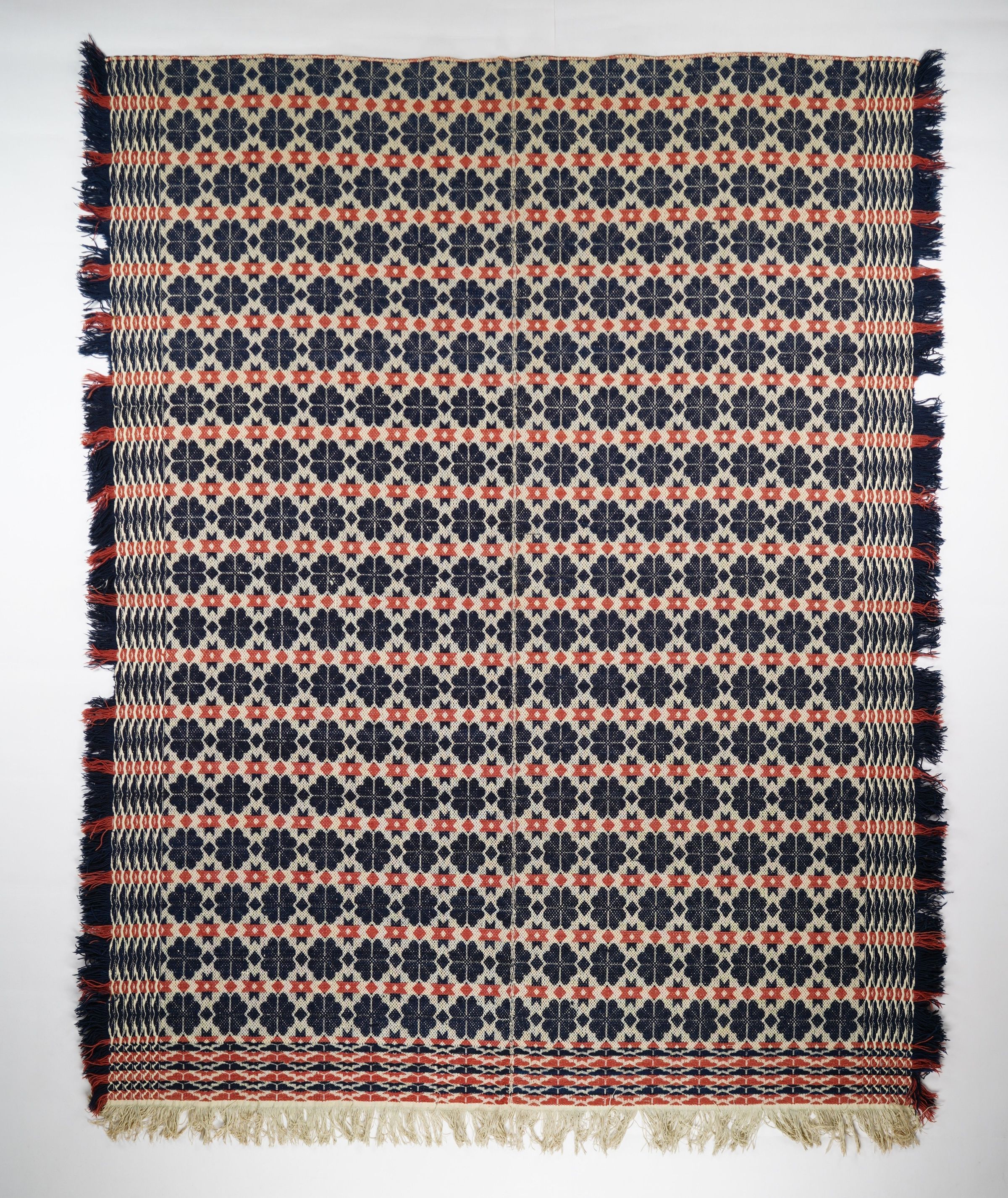 Navy, red, and natural geometric starwork coverlet with border and self-fringe on three sides. Two joined panels.Context