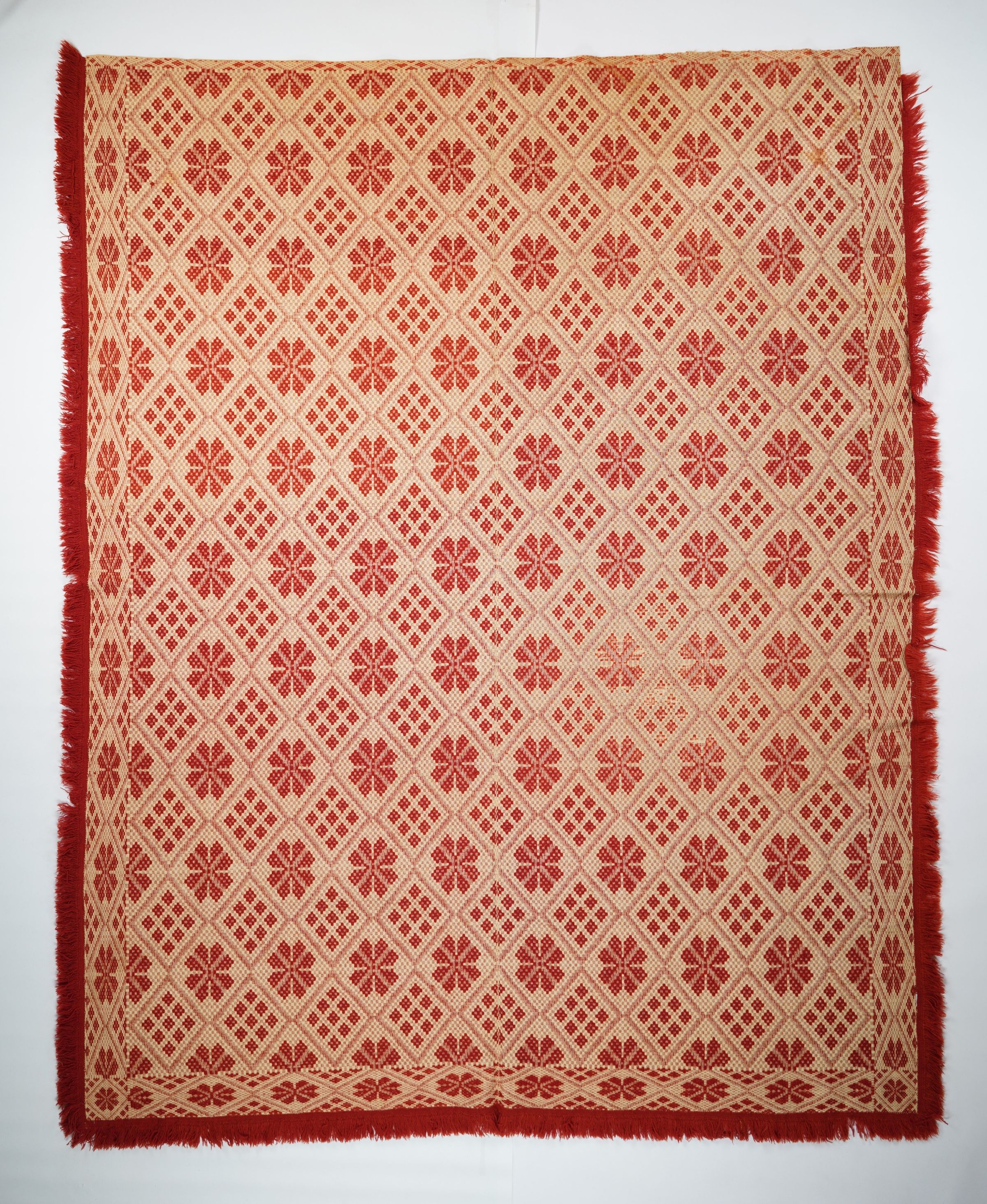 Red and natural geometric starwork coverlet with border on four sides and applied fringe on three sides. Two joined panels.Collection
