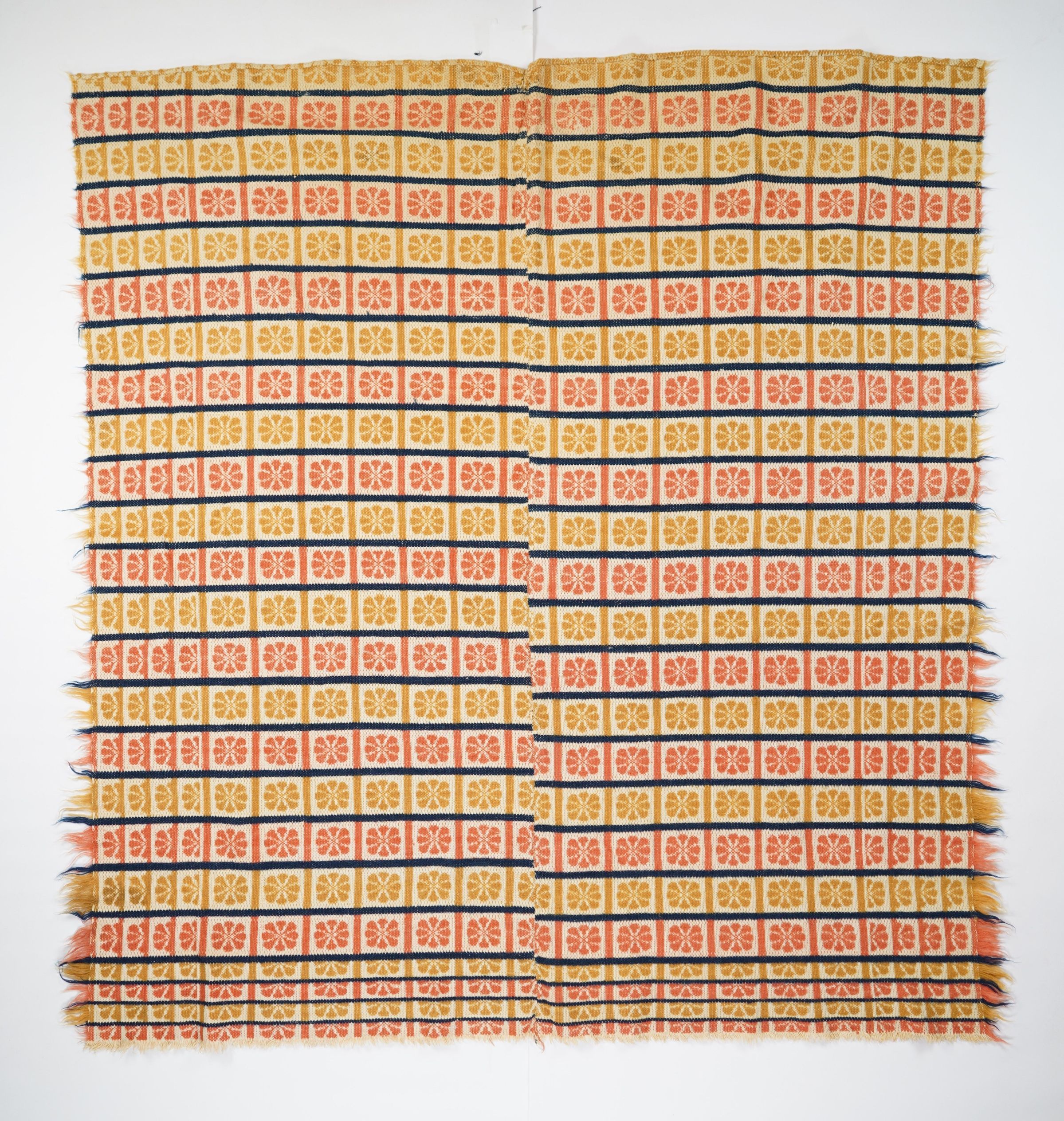 Yellow, red, navy, and natural geometric starwork coverlet with border and self-fringe on three sides. Two joined panels.Collection