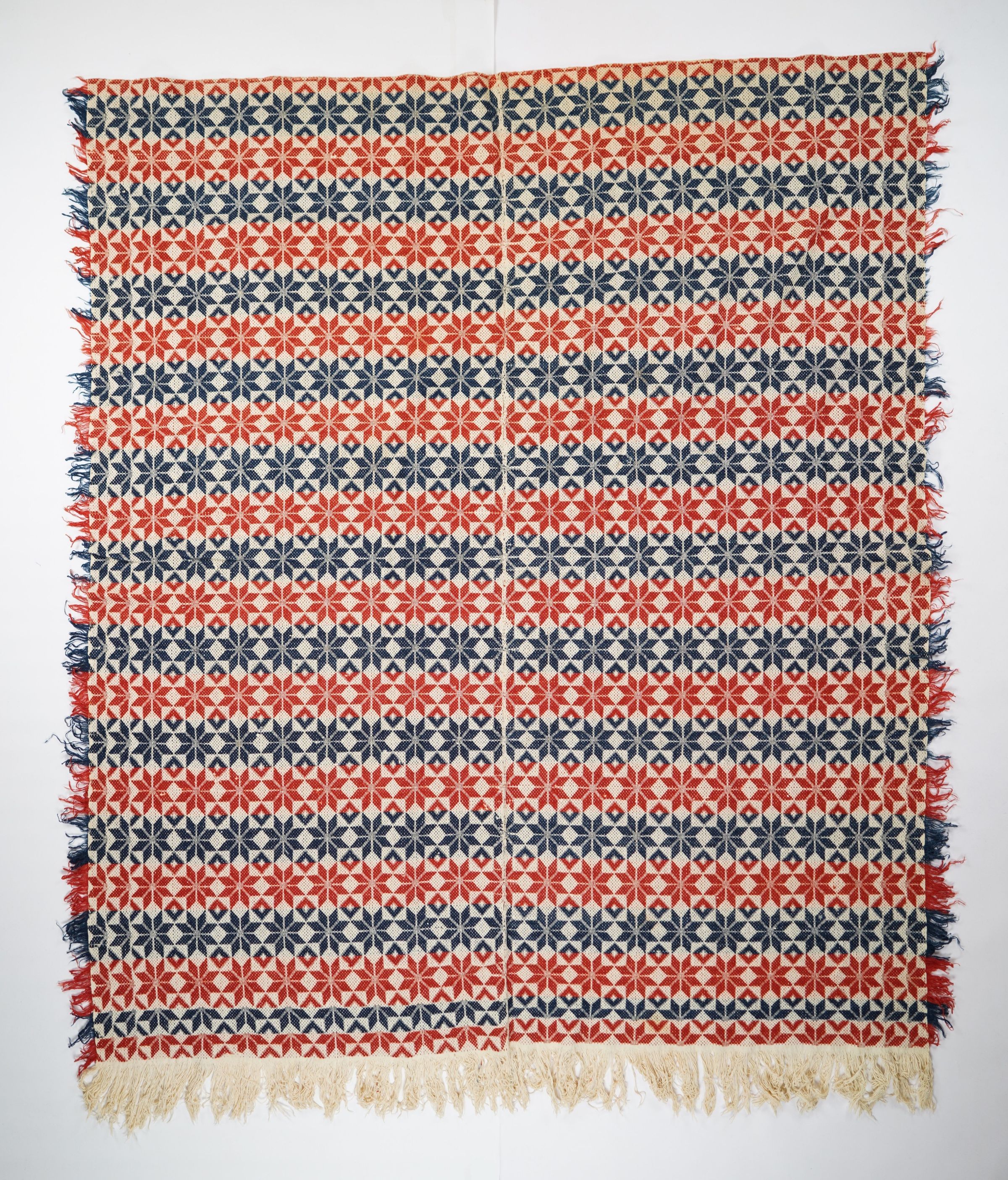 Red, navy, and natural geometric starwork coverlet with border and self-fringe on three sides. Two joined panels.