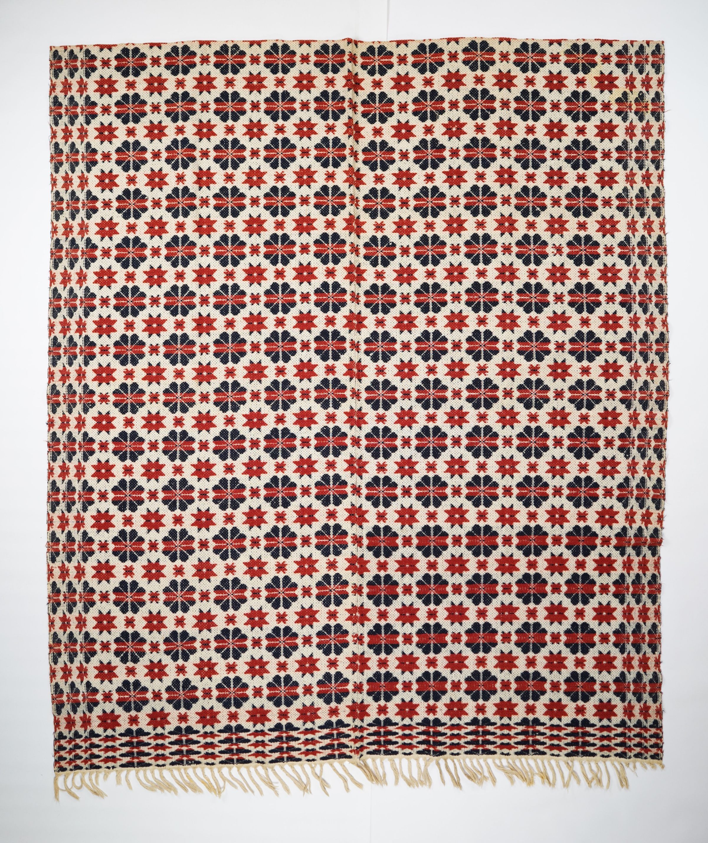 Red, navy, and natural geometric starwork coverlet with border on three sides and self-fringe along bottom.