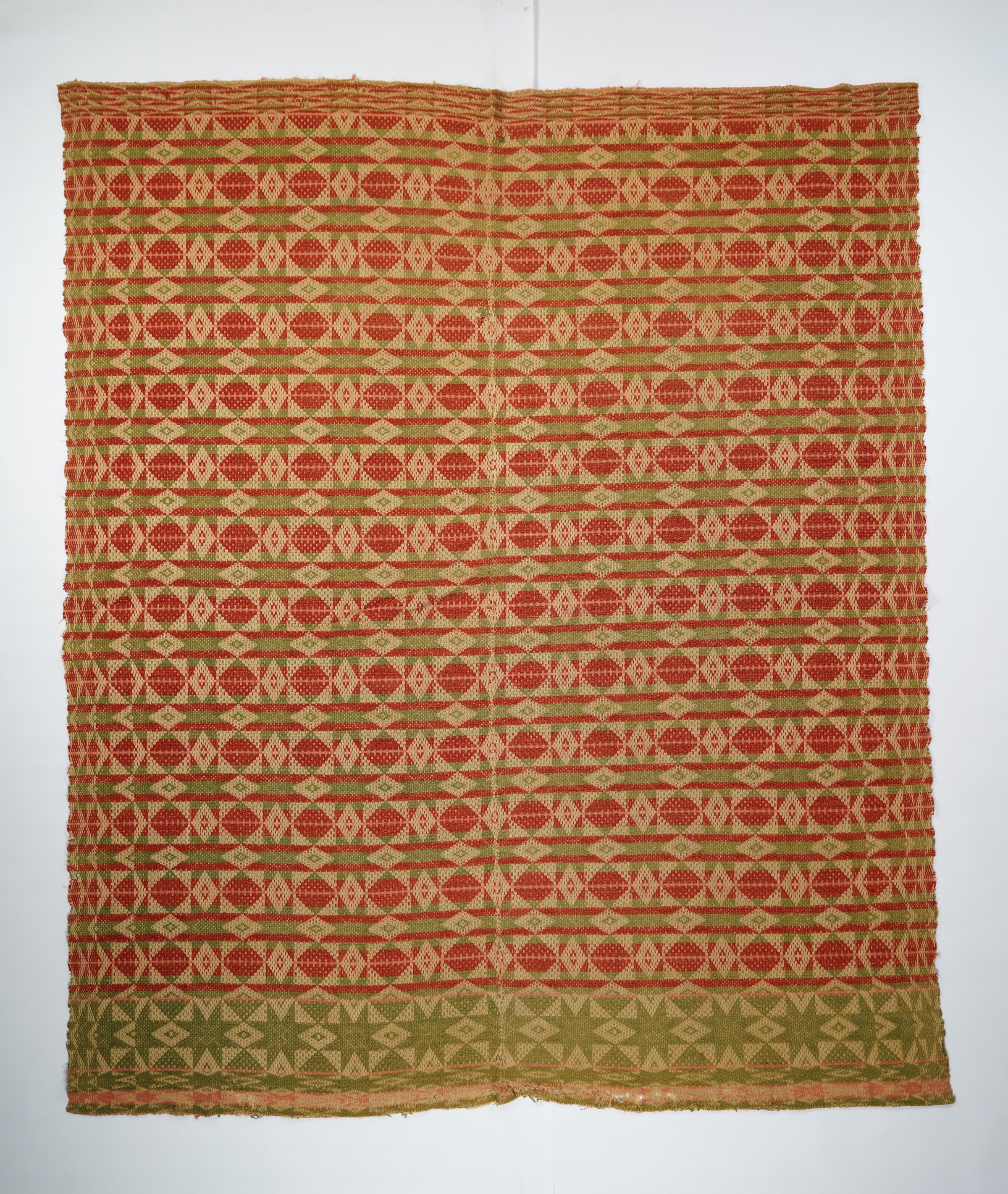 Red, green, pink, and natural geometric coverlet with border on four sides. Two joined panels.Collection