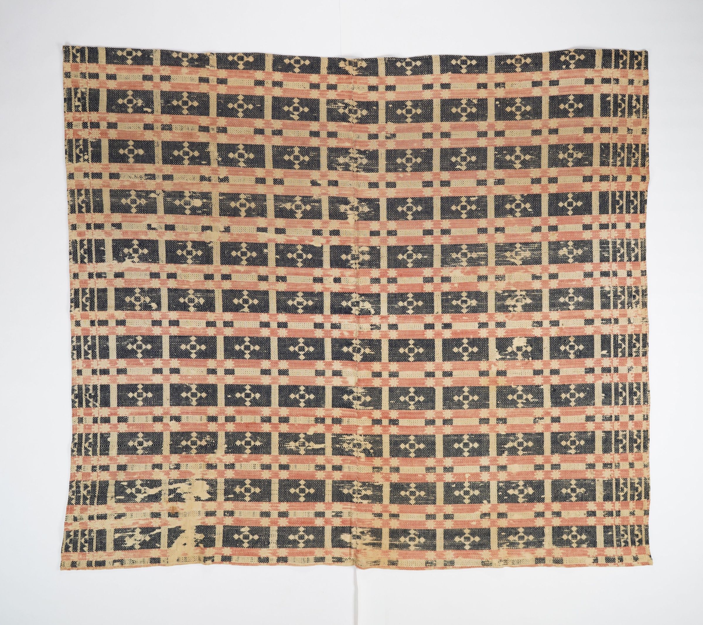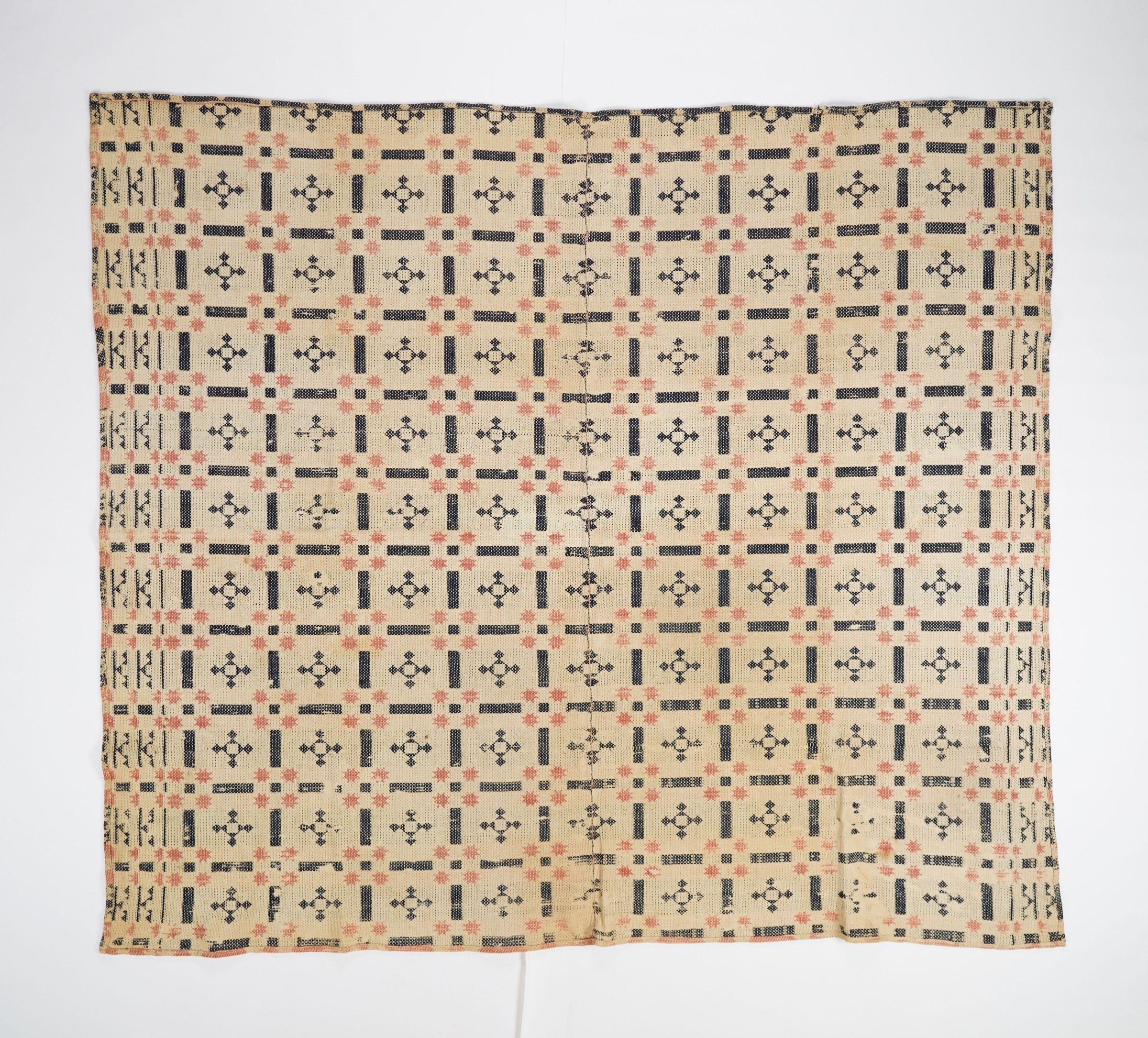 Red, navy, and natural geometric coverlet with border on three sides. Two joined panels.