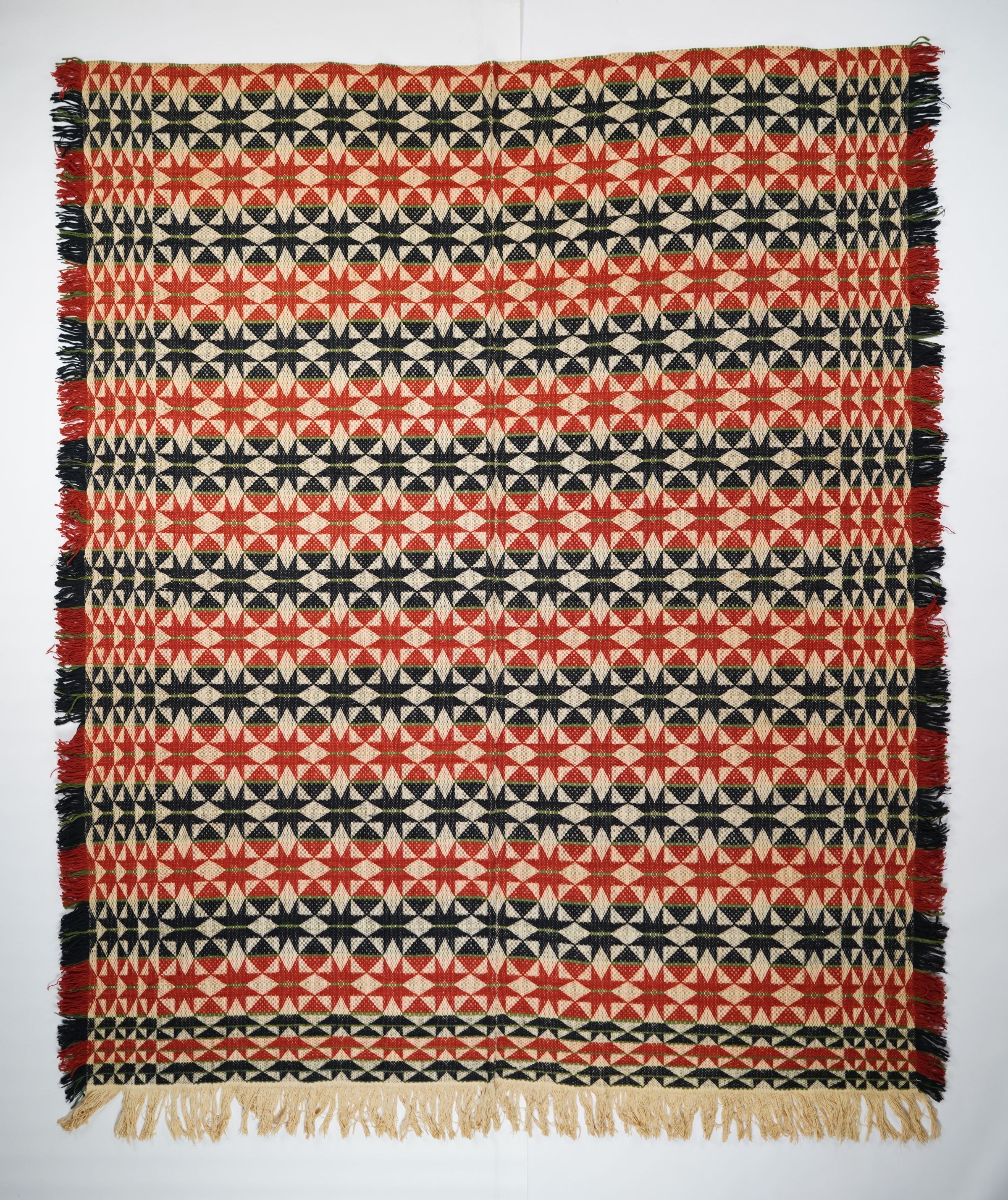 Red, green, navy and natural geometric starwork coverlet with self-fringe and border on three sides. Two joined panels.Collection