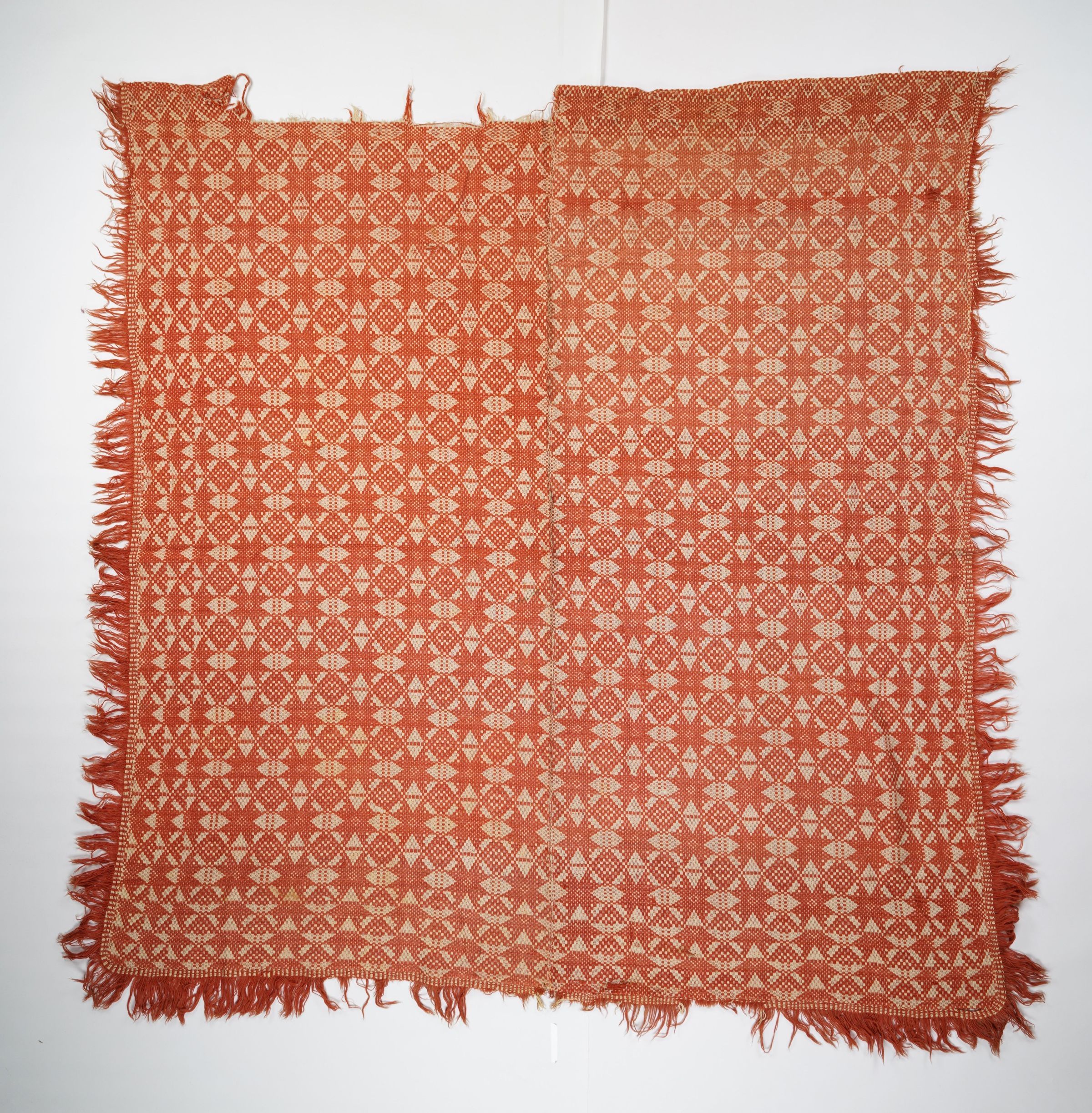 Red and natural geometric starwork coverlet with border and applied fringe on three sides. Two joined panels.
