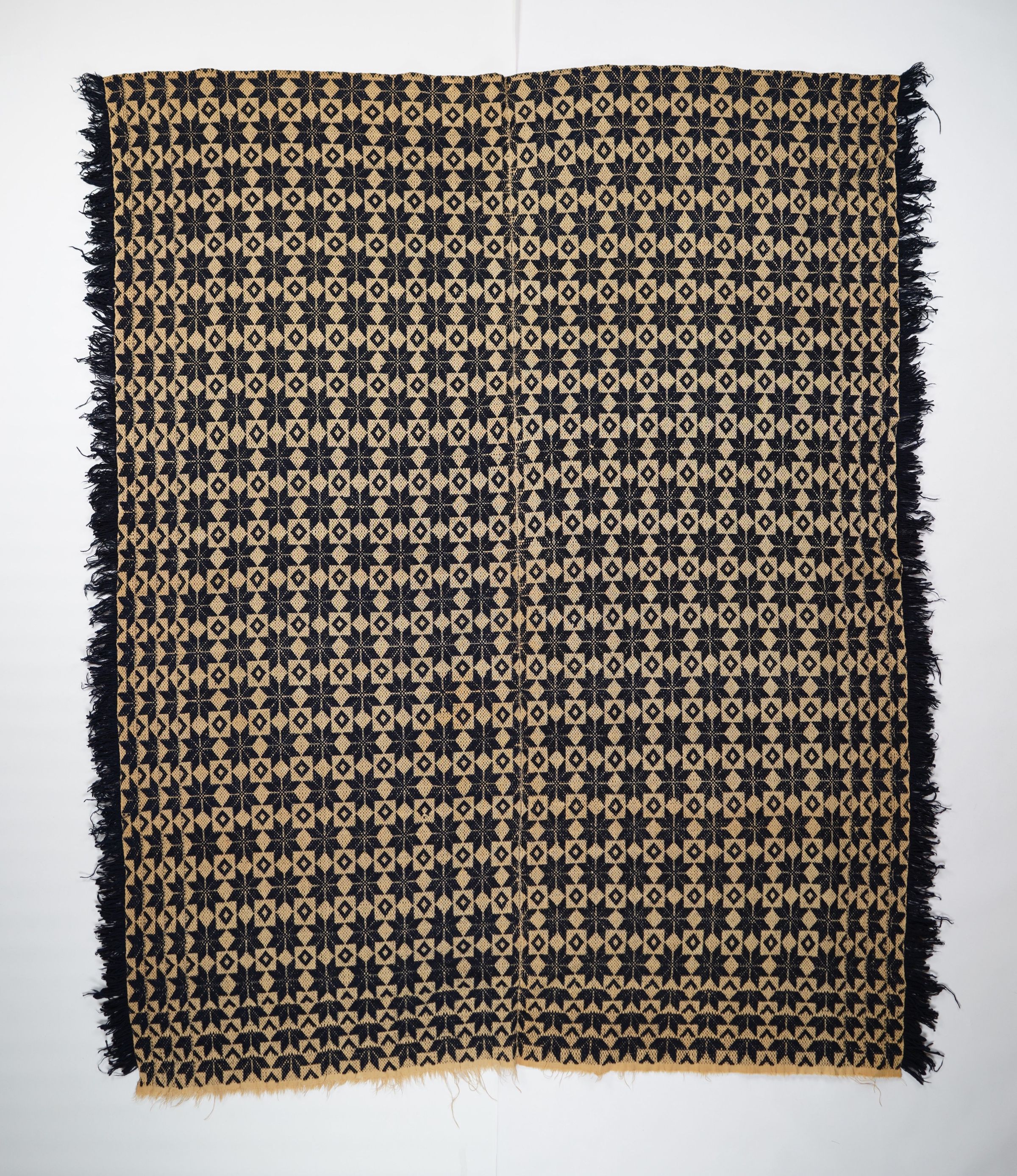 Navy and natural geometric starwork coverlet with border and self-fringe on three sides. Two joined panels.