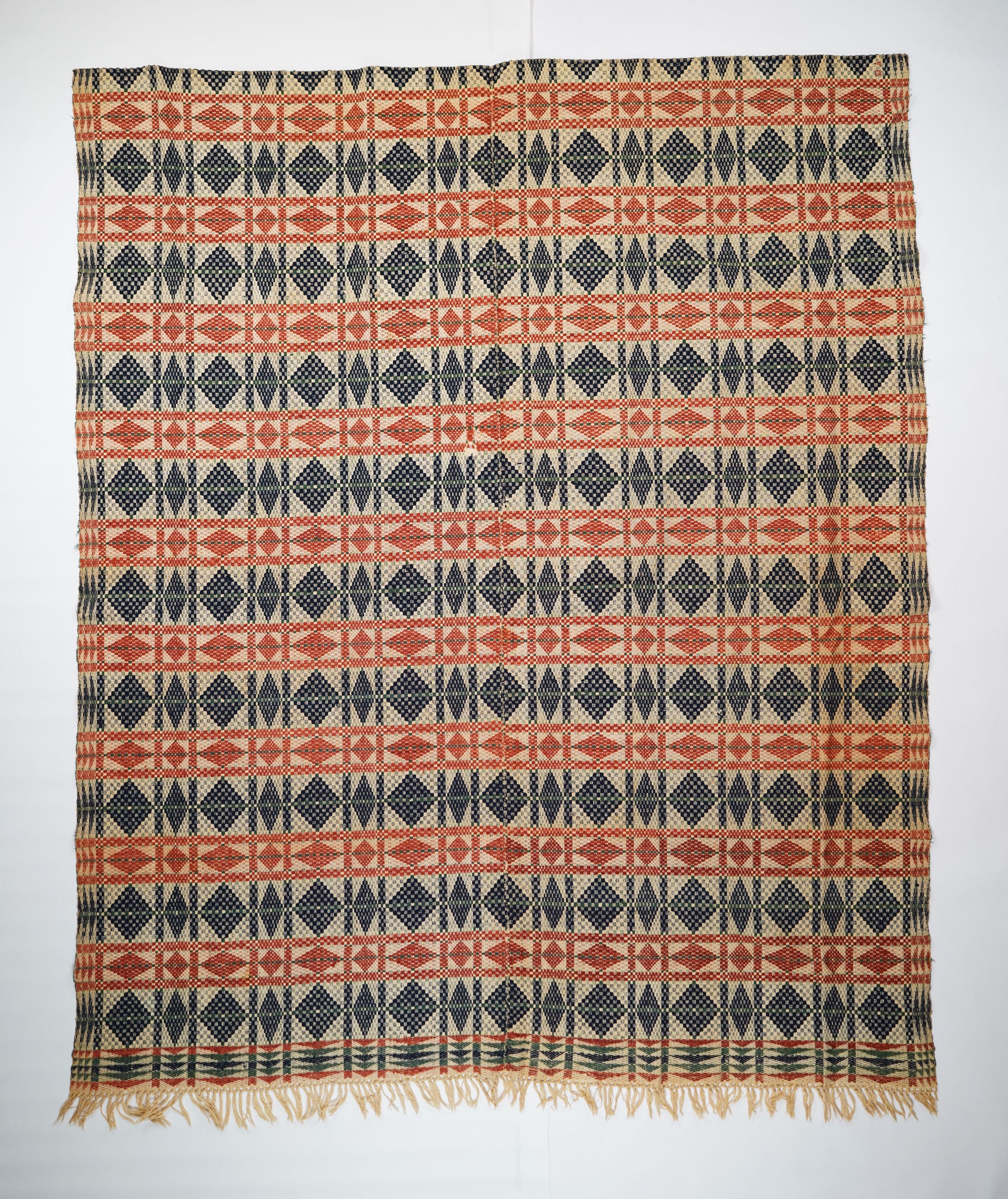 Navy, red, green, and natural geometric overshot coverlet with border on three sides and self-fringe along bottom. Two joined panels.Collection