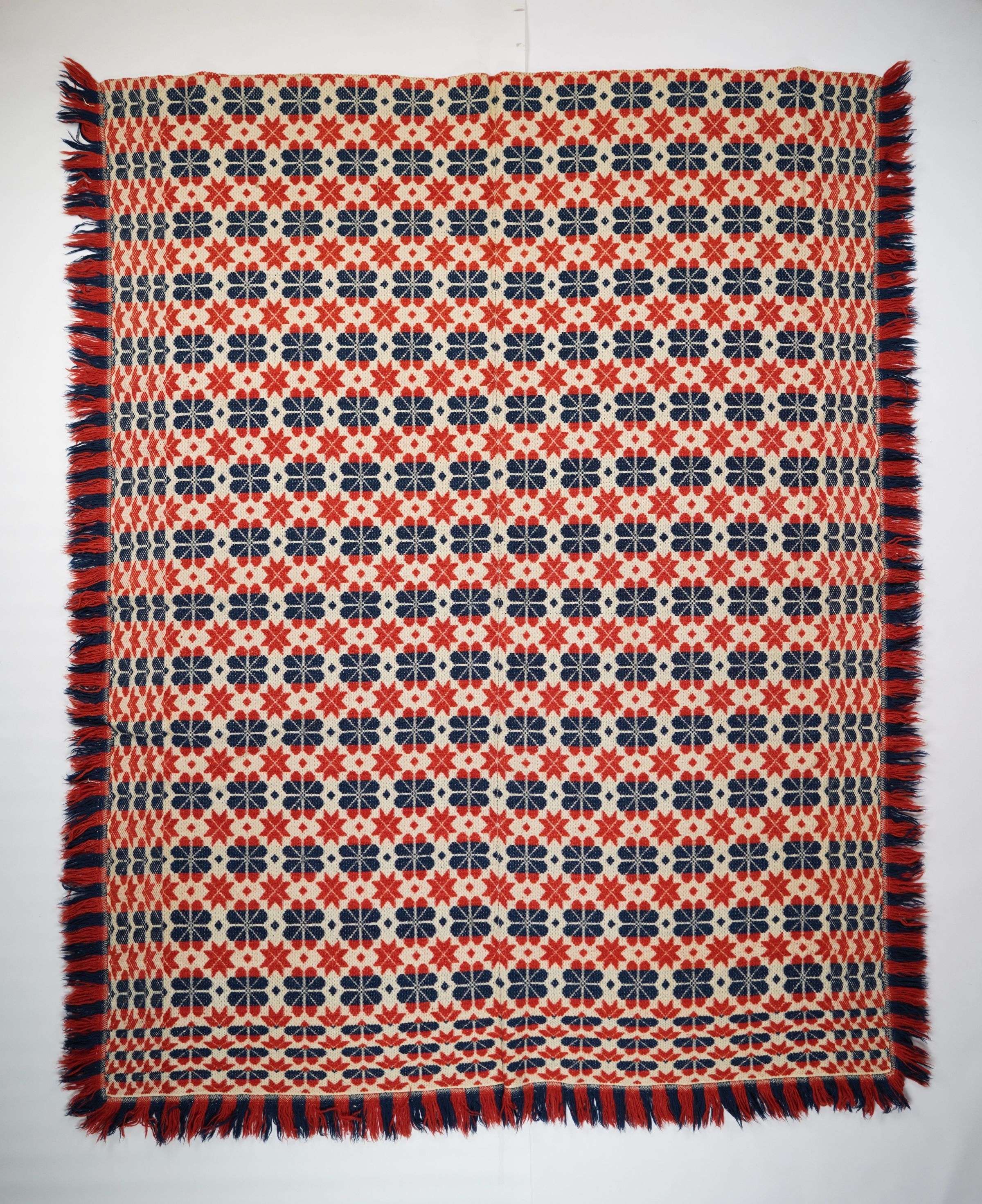 Red, navy, and natural geometric starwork coverlet with border and applied fringe on three sides. Two joined panels.