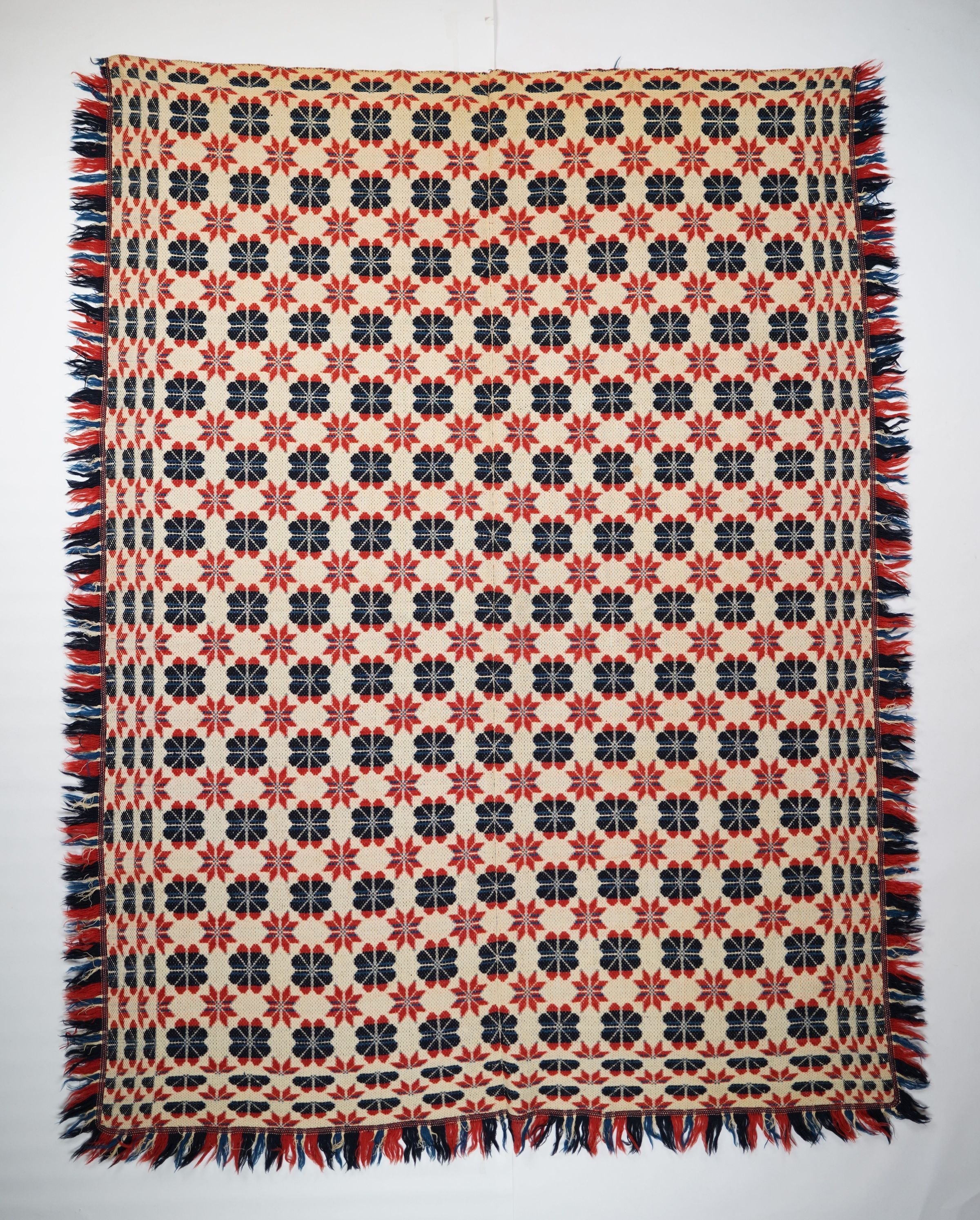 Red, navy, blue, and natural geometric starwork coverlet with border and applied fringe on three sides. Two joined panels.Collection