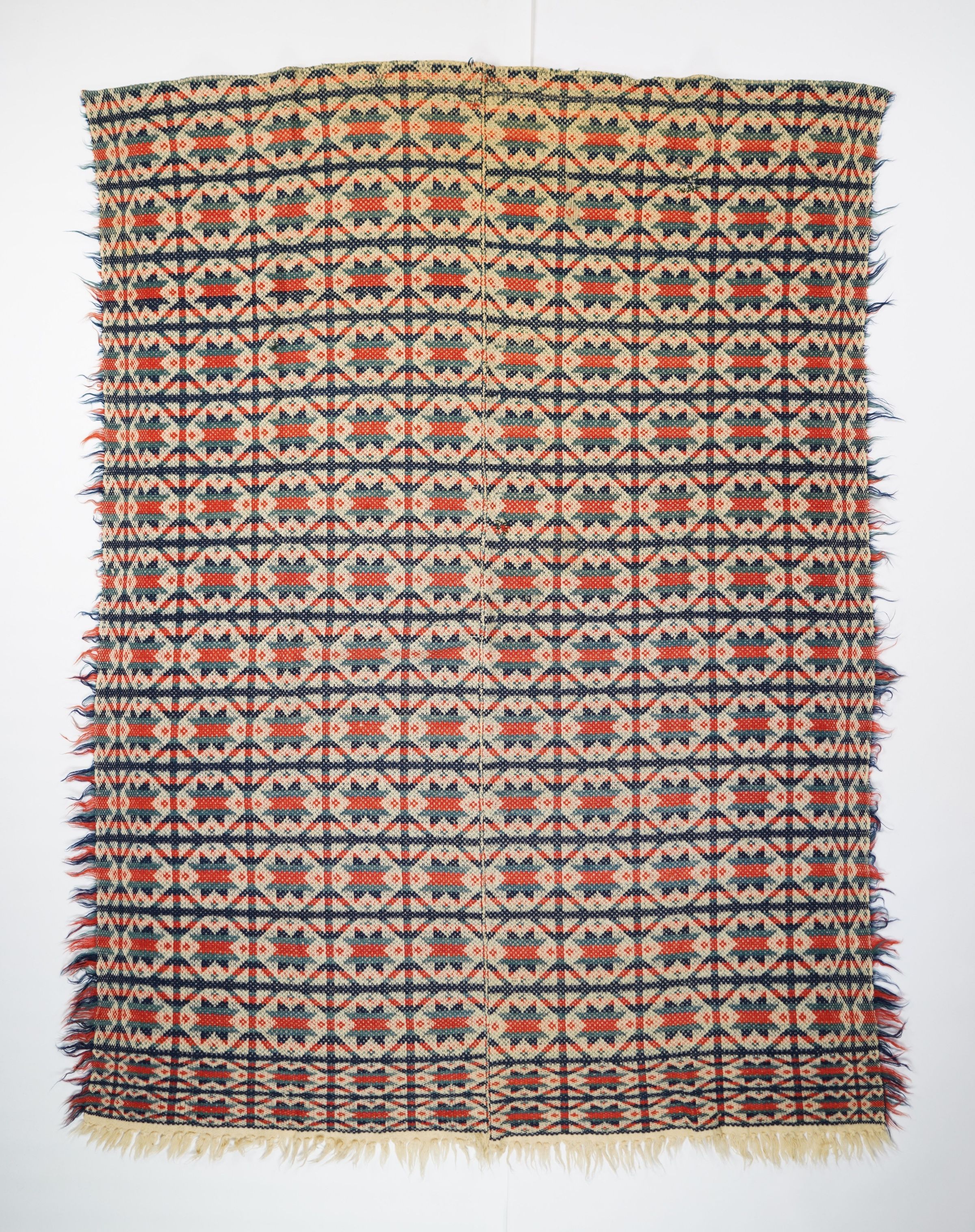 Red, navy, blue/green, natural geometric starwork coverlet with self-fringe and border on three sides. Two joined panelsCollection