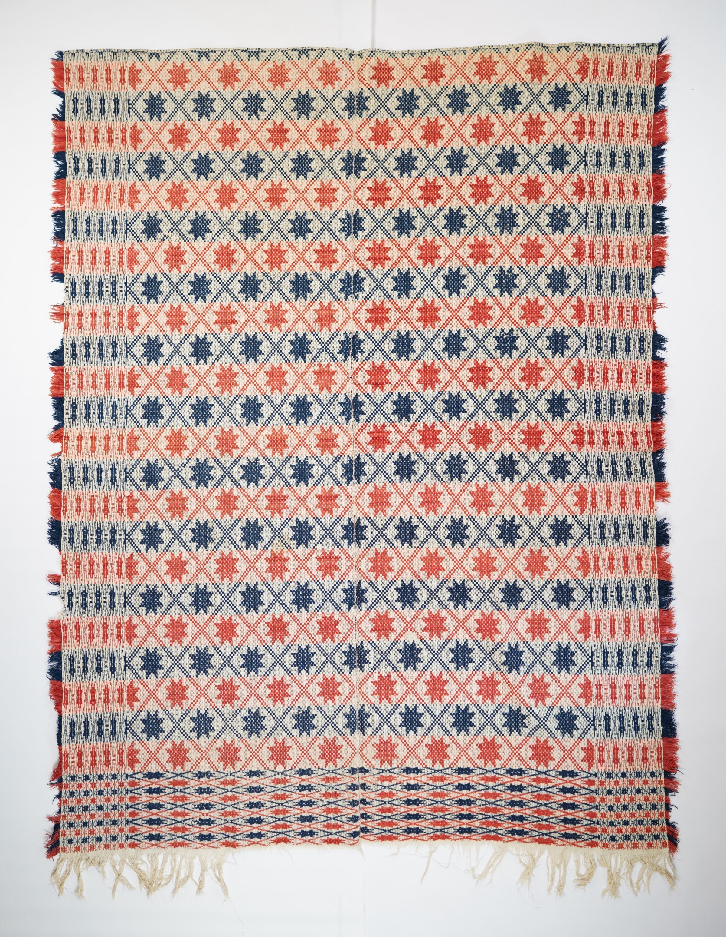 Red, navy, and natural geometric starwork coverlet with border and self-fringe on three sides. Two joined panels
