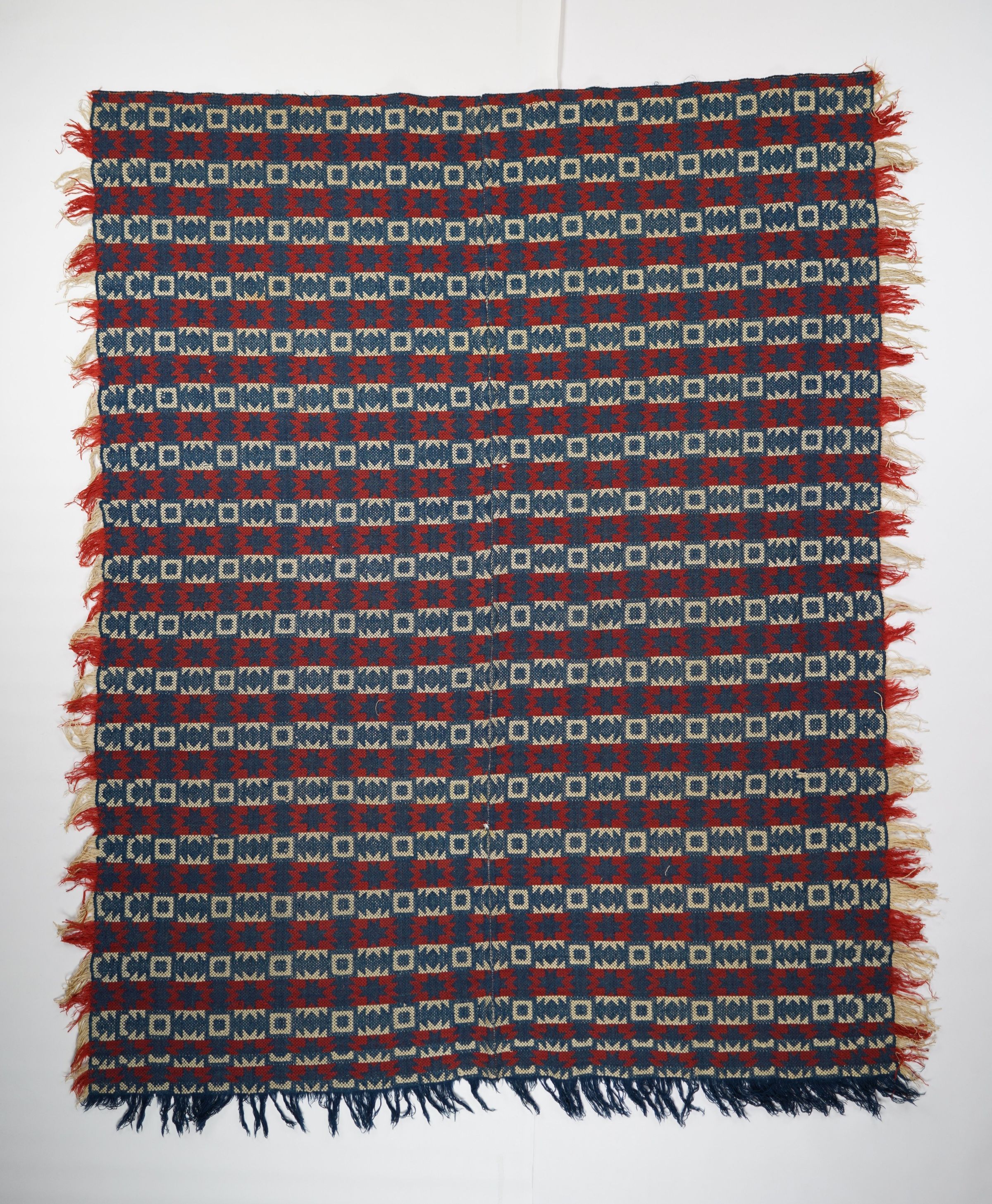 Red, navy, and natural geometric starwork coverlet with border and self-fringe on three sides. Two joined panels.