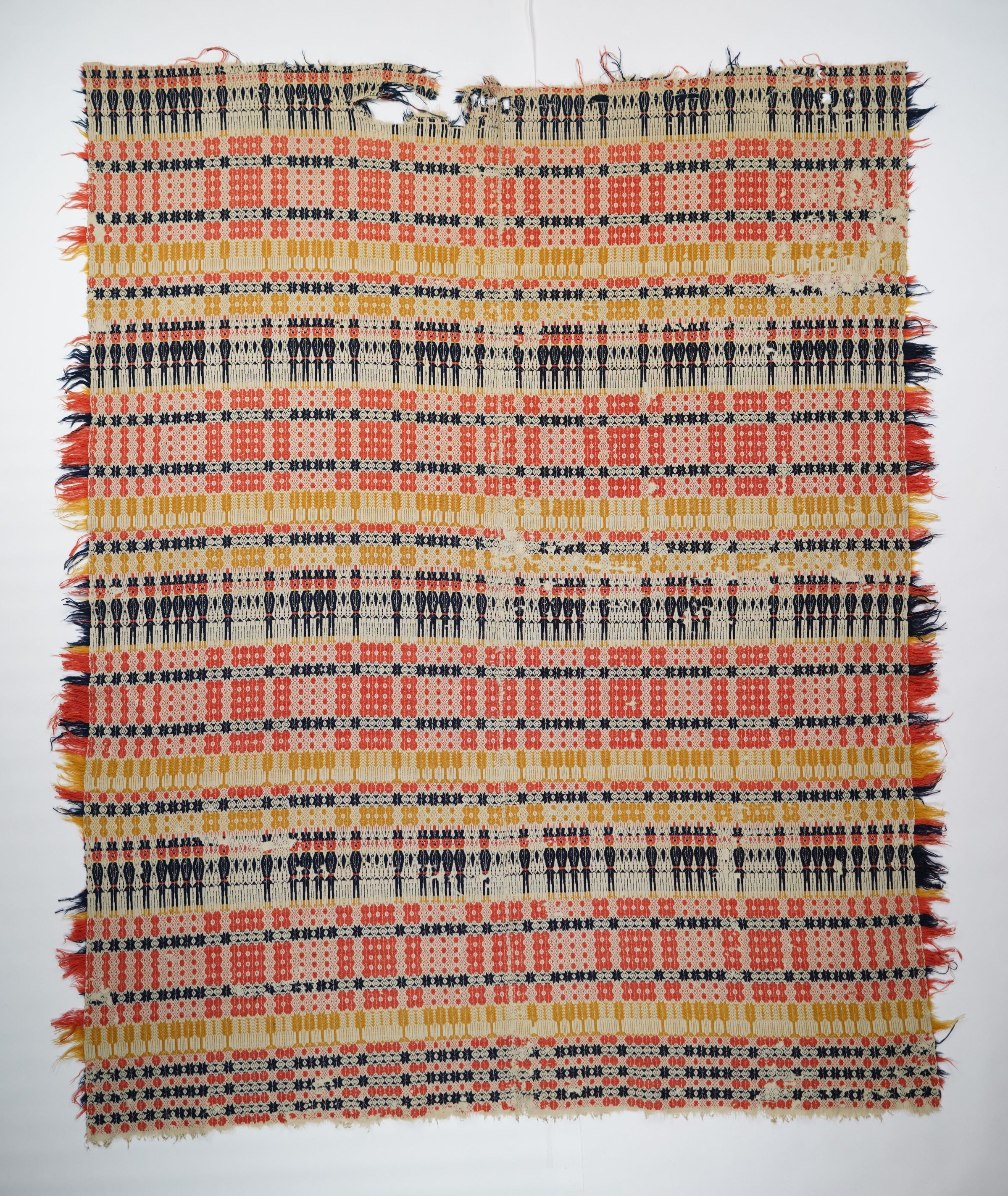 Yellow, red, navy, and natural geometric starwork coverlet with border and self-fringes on three sides. Two joined panels.Collection
