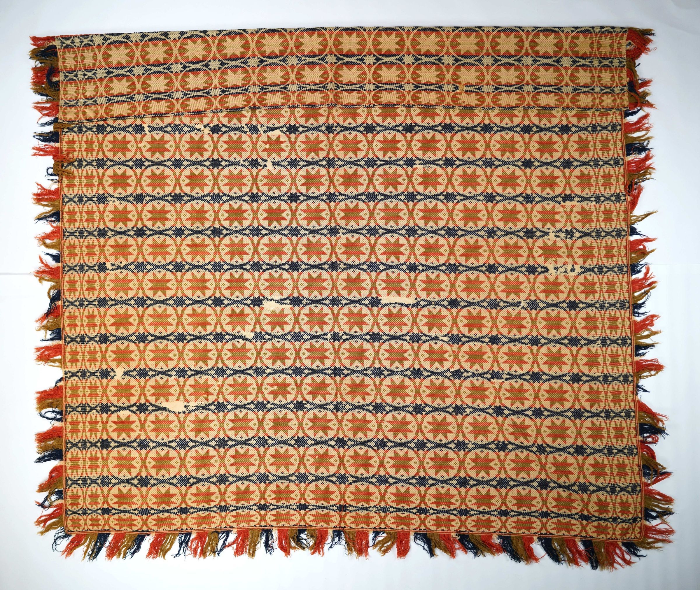 Geometric starwork coverlet with borders on four sides and applied fringe on sides and bottom. Woven full-width; seamless. Navy blue, red, and green wool with natural cotton. Stars in circles centerfield pattern with geometric borders.Collection