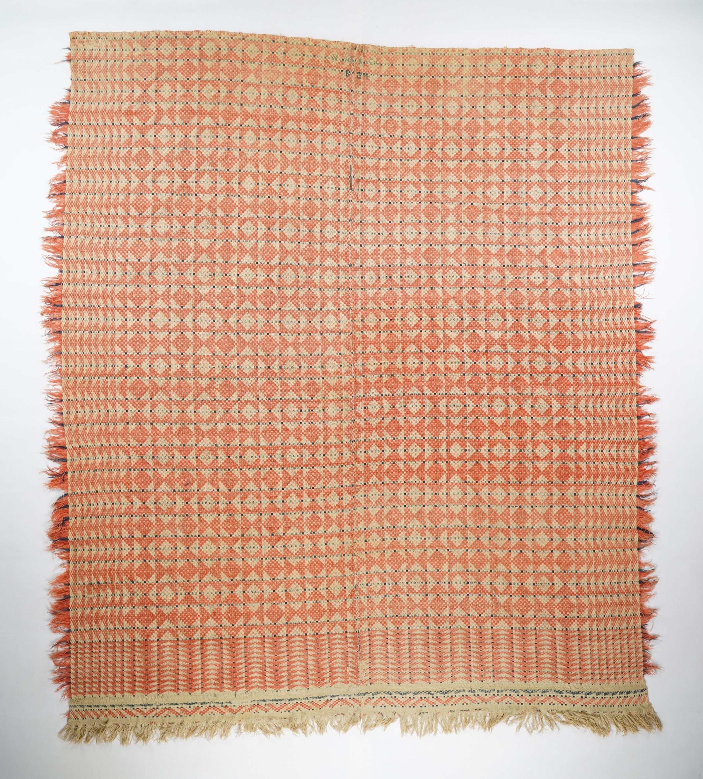 Geometric starwork coverlet with borders on 3 sides and self-fringe on sides and bottom. Two panels joined by a center seam. Navy and red wool with undyed cotton. Abstract centerfield pattern; abstract border on sides and bottom. Unknown weaver.Context