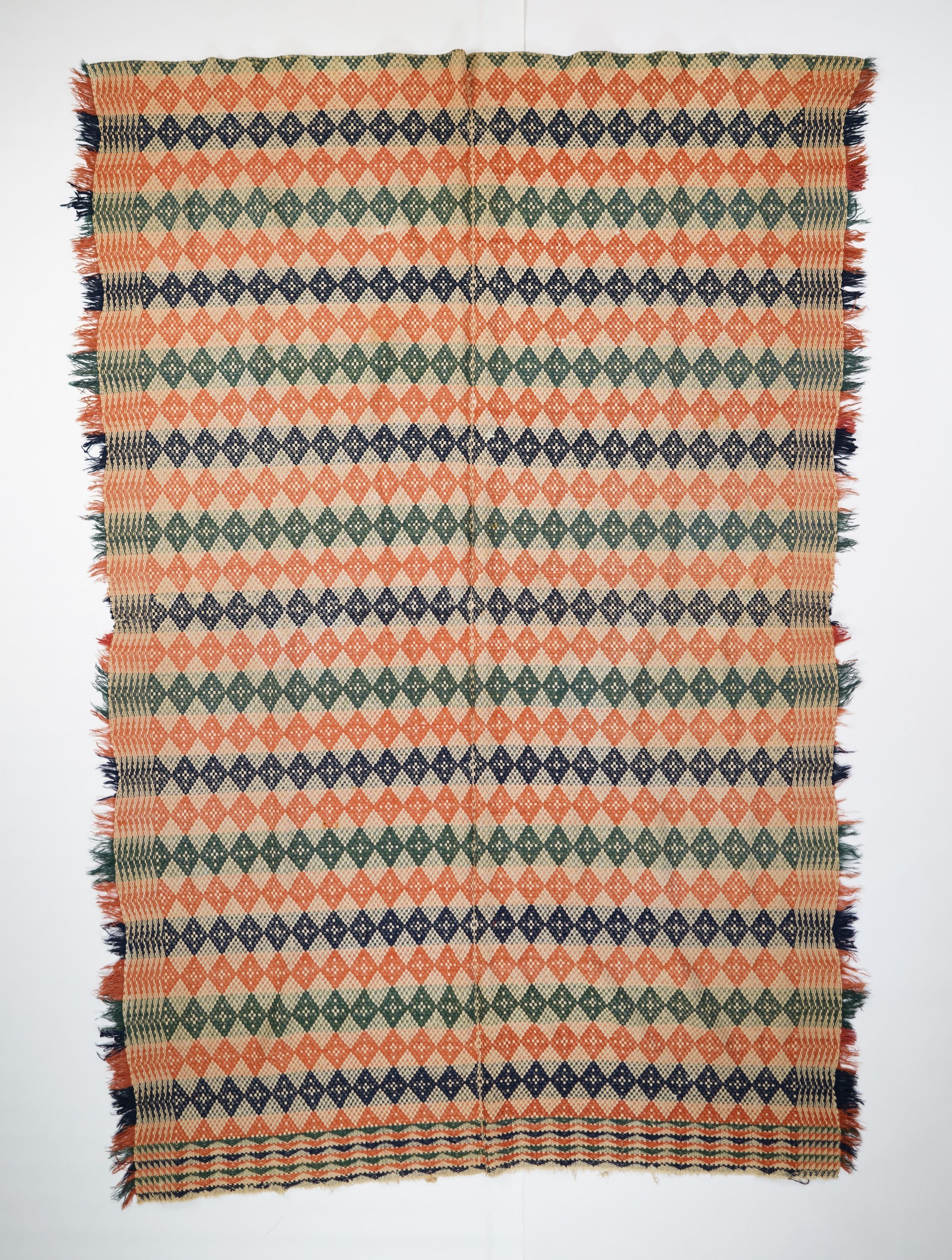 Red, green, navy, and natural geometric starwork coverlet with border on three sides and self fringe on two sides. Two joined panels.Collection