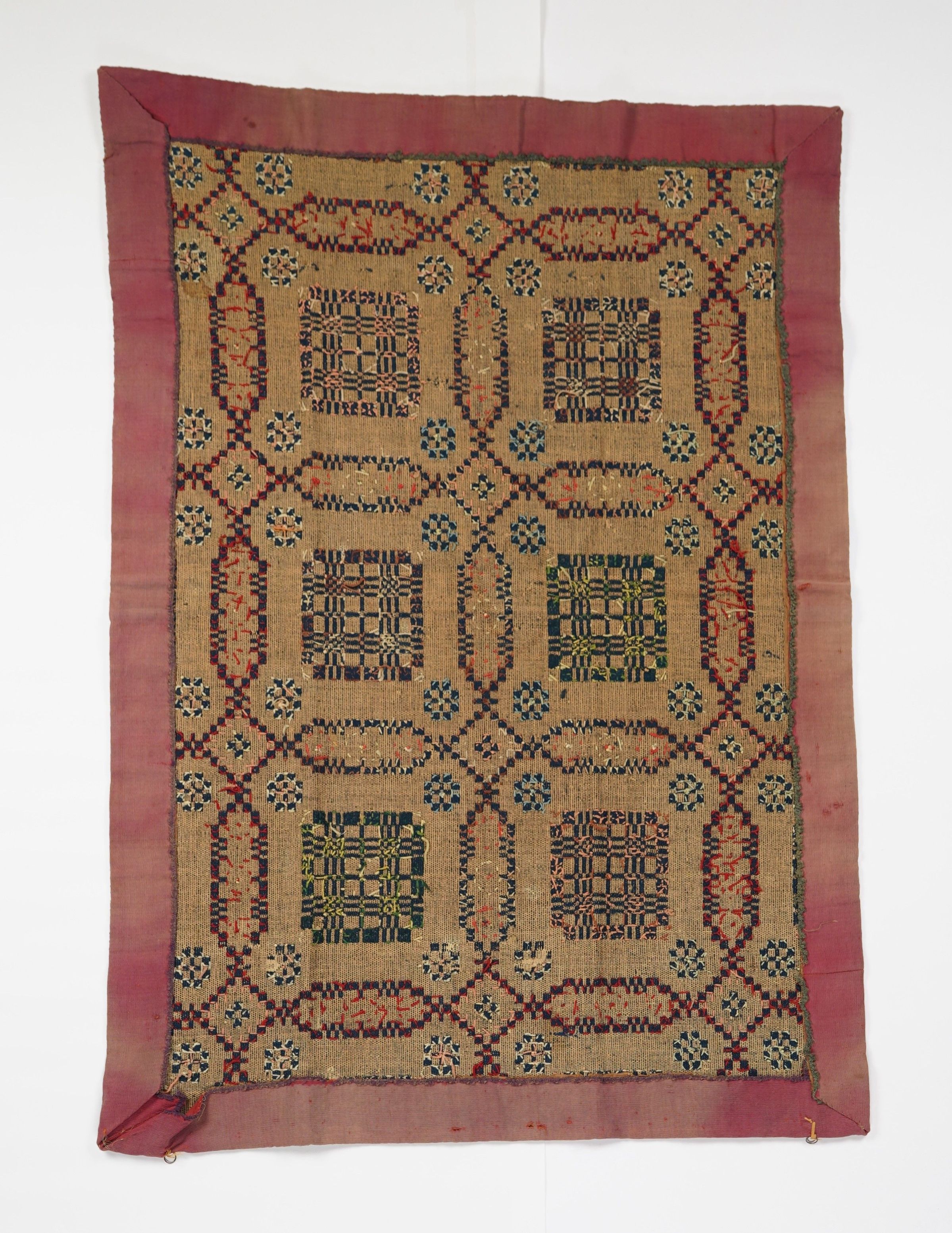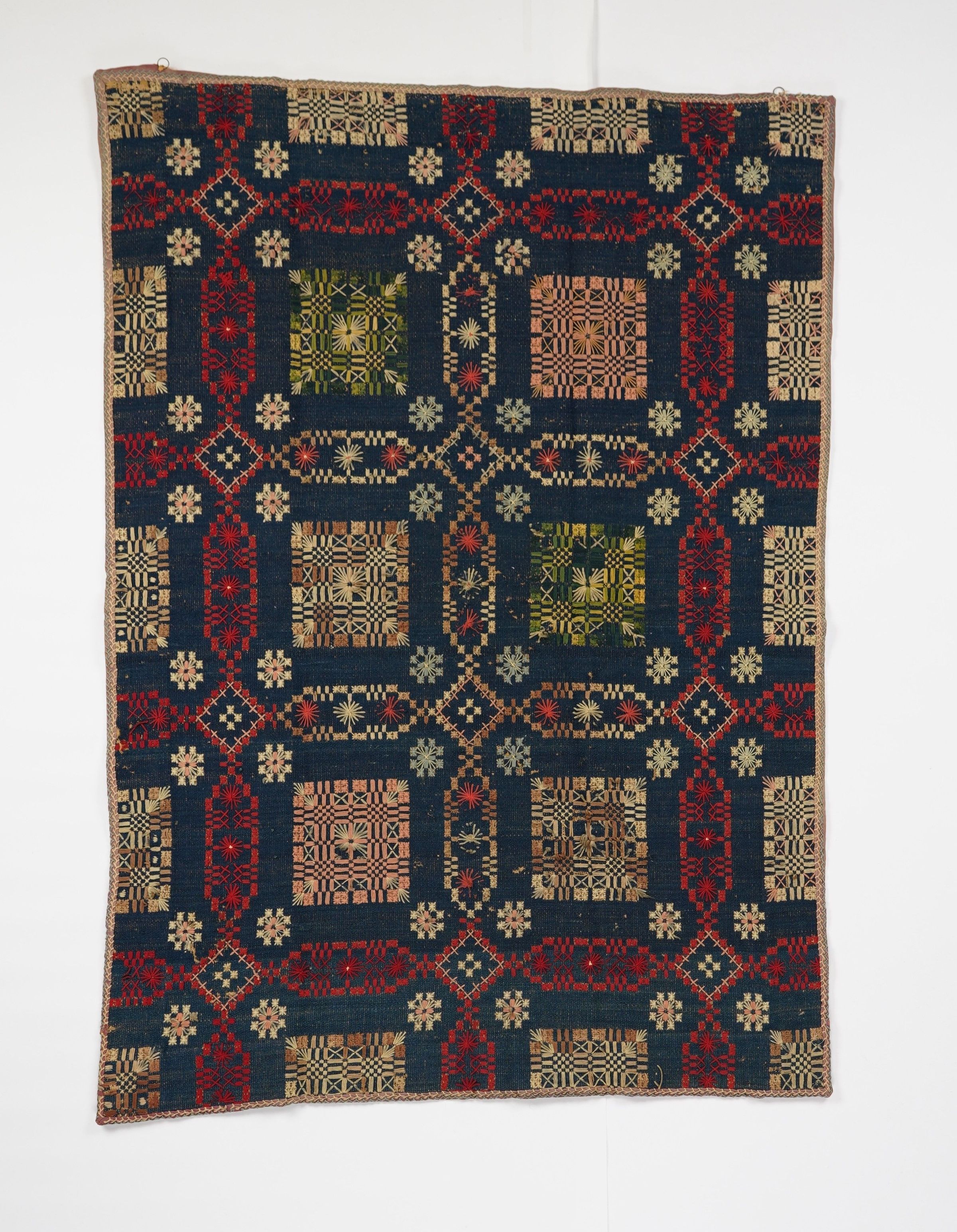 Red, navy, green, pink, yellow, and natural geometric coverlet. Navy and natural wove textile with red, pink, green, yellow, light blue, and natural embroidery/cross-stitching.Collection