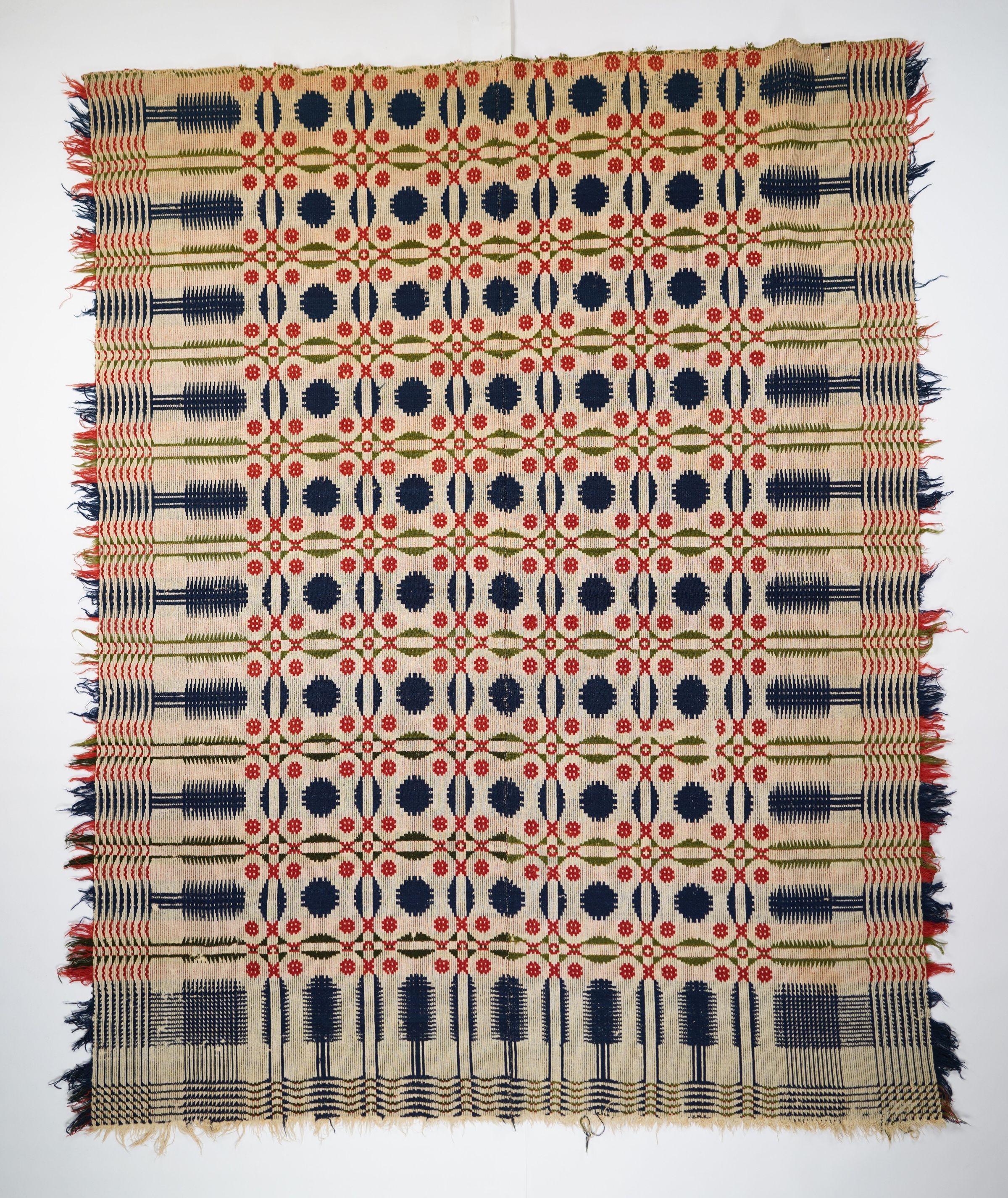 Red, green, navy, and natural geometric coverlet with self-fringe and border on three sides. Two joined panels.Collection