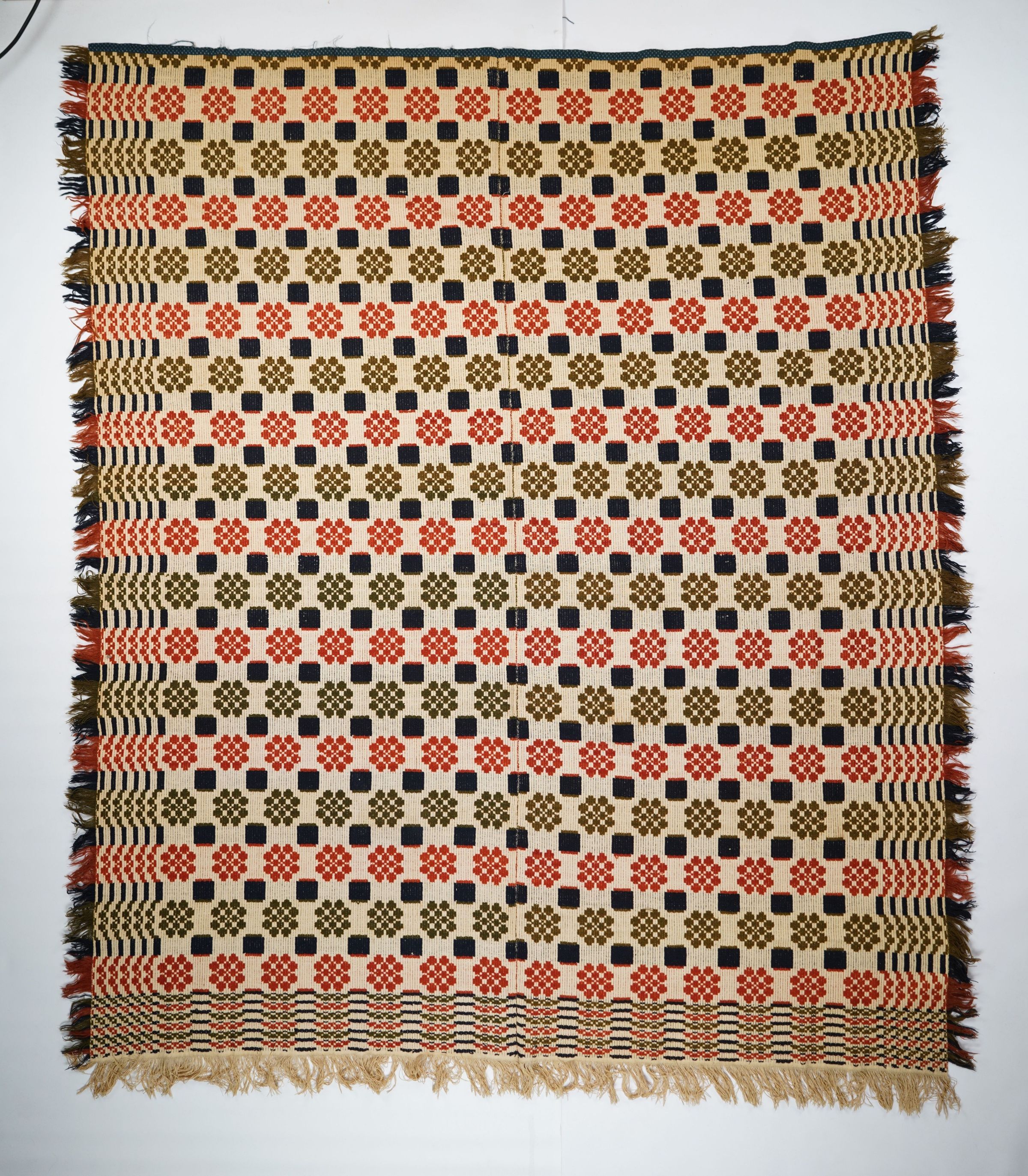 Green, red, navy, and natural geometric tied beiderwand coverlet with border and self-fringe on three sides.Collection