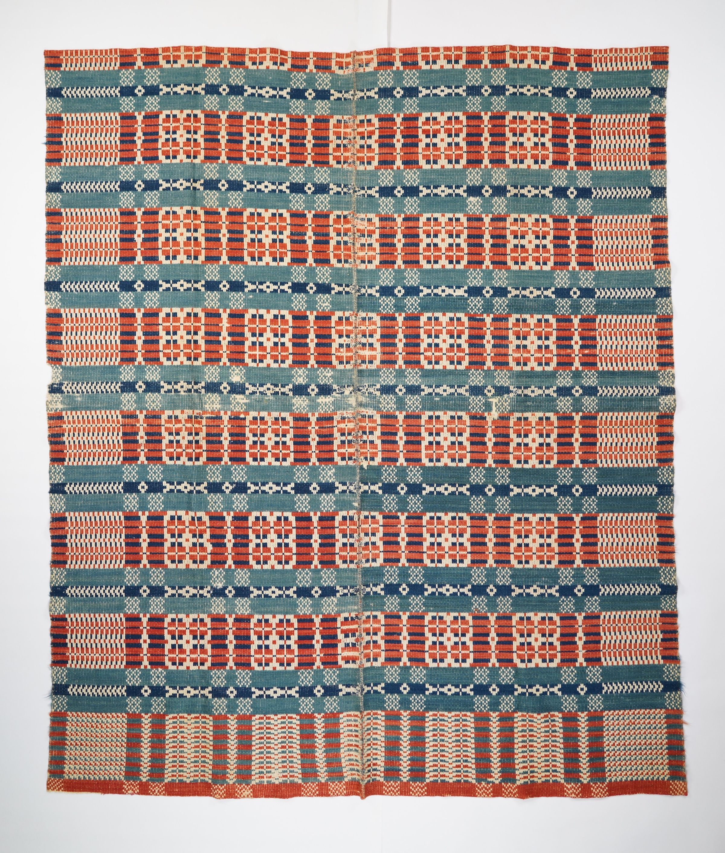 Red, blue, navy, and natural geometric tied beiderwand coverlet with border on three sides. Two joined panels.Collection