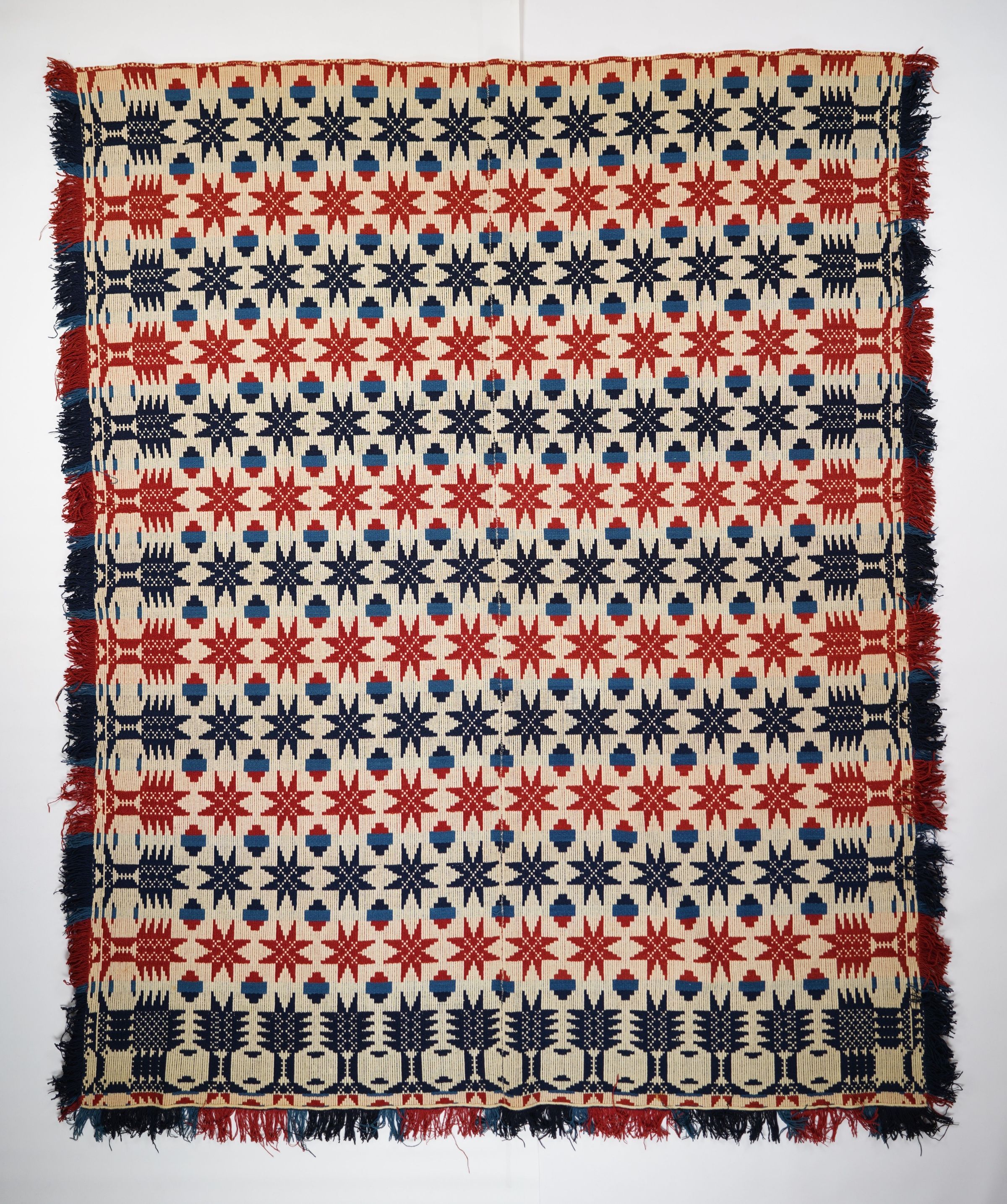 Red, blue, navy, and natural geometric tied beiderwand coverlet with border and fringe on three sides. Two joined panels.Collection