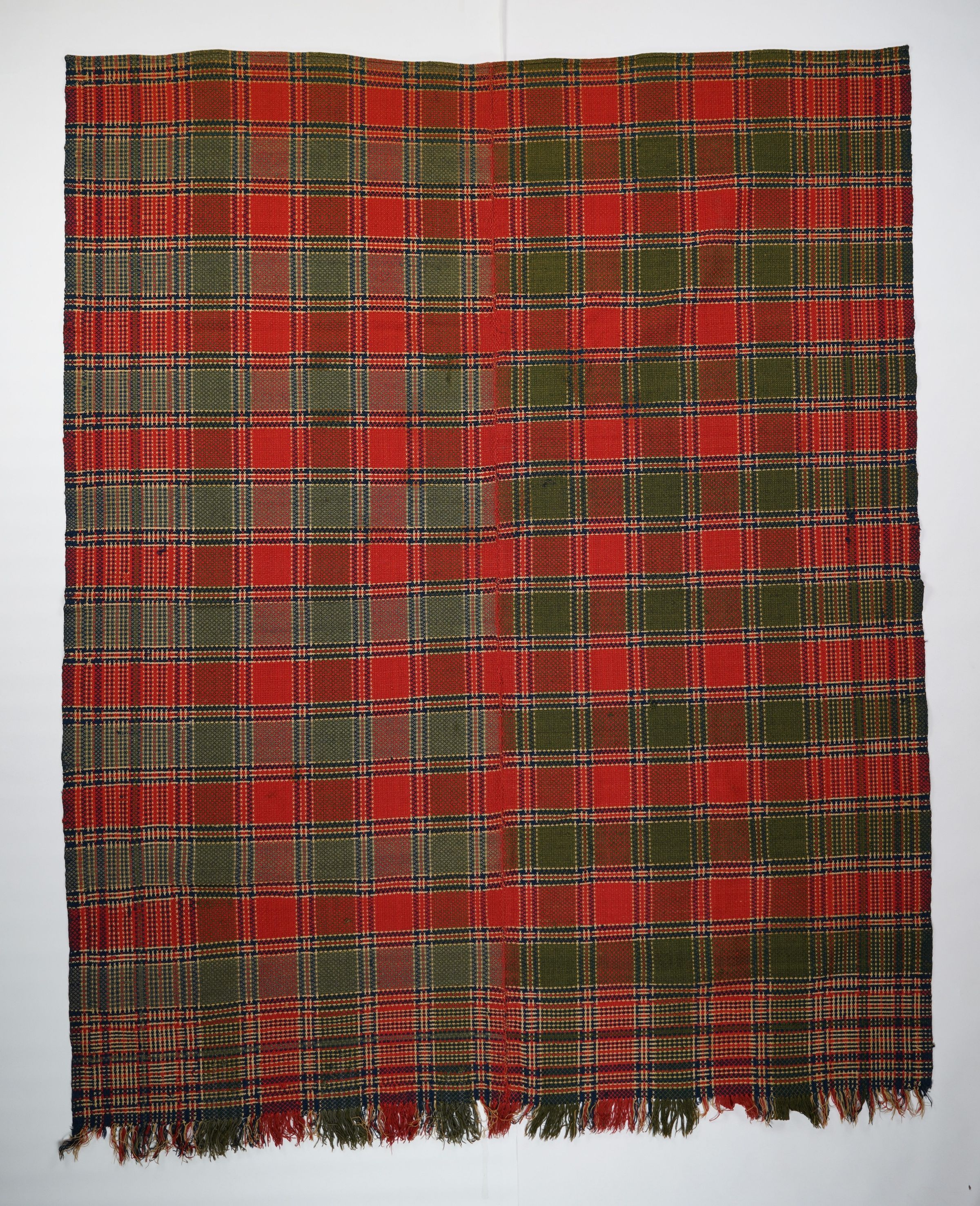 Red, navy, green, and natural geometric coverlet with border on three sides and self-fringe along bottom. Two joined panels.Collection