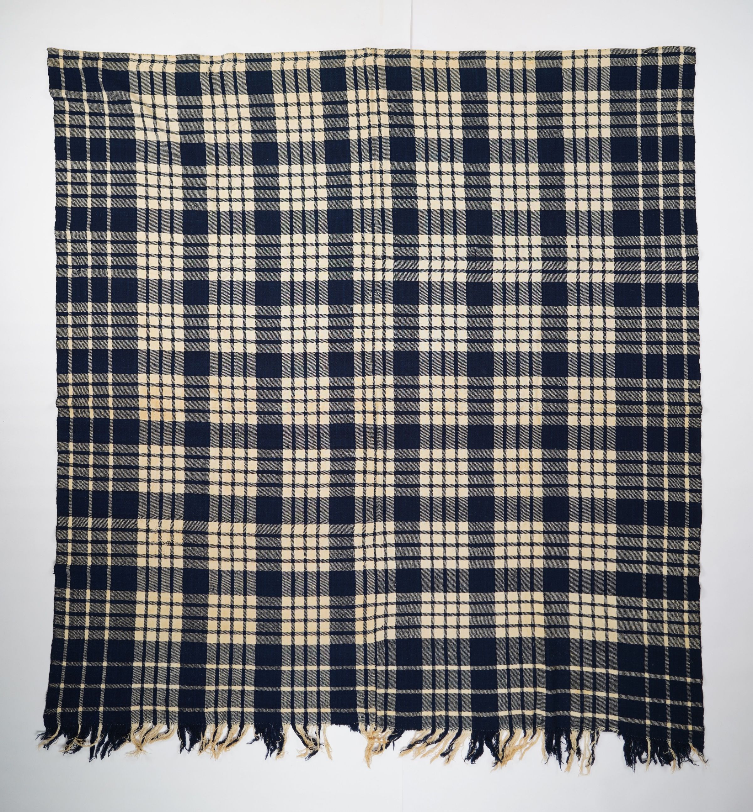 Navy and natural geometric twill coverlet with border on three sides and self-fringe along bottom. Two joined panels.