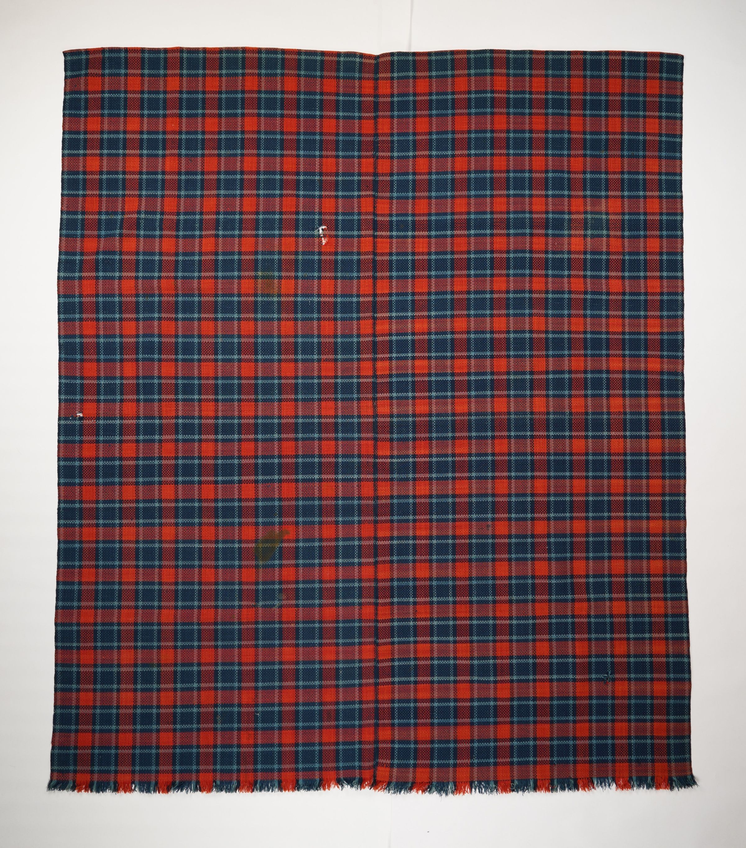 Red, blue, and navy geometric twill coverlet with self-fringe along bottom. Two joined panels.