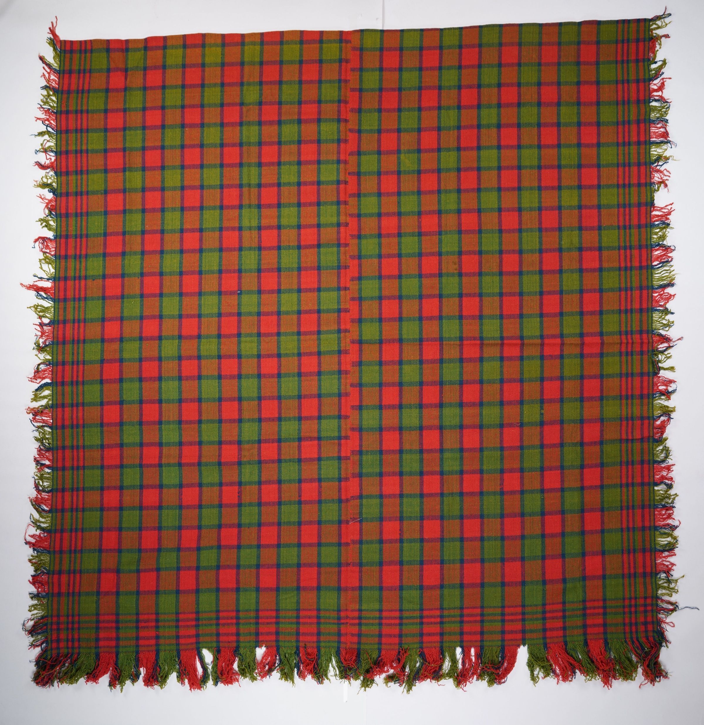 Green, navy, and red geometric twill coverlet with border and self-fringe on three sides. Two joined panels.
