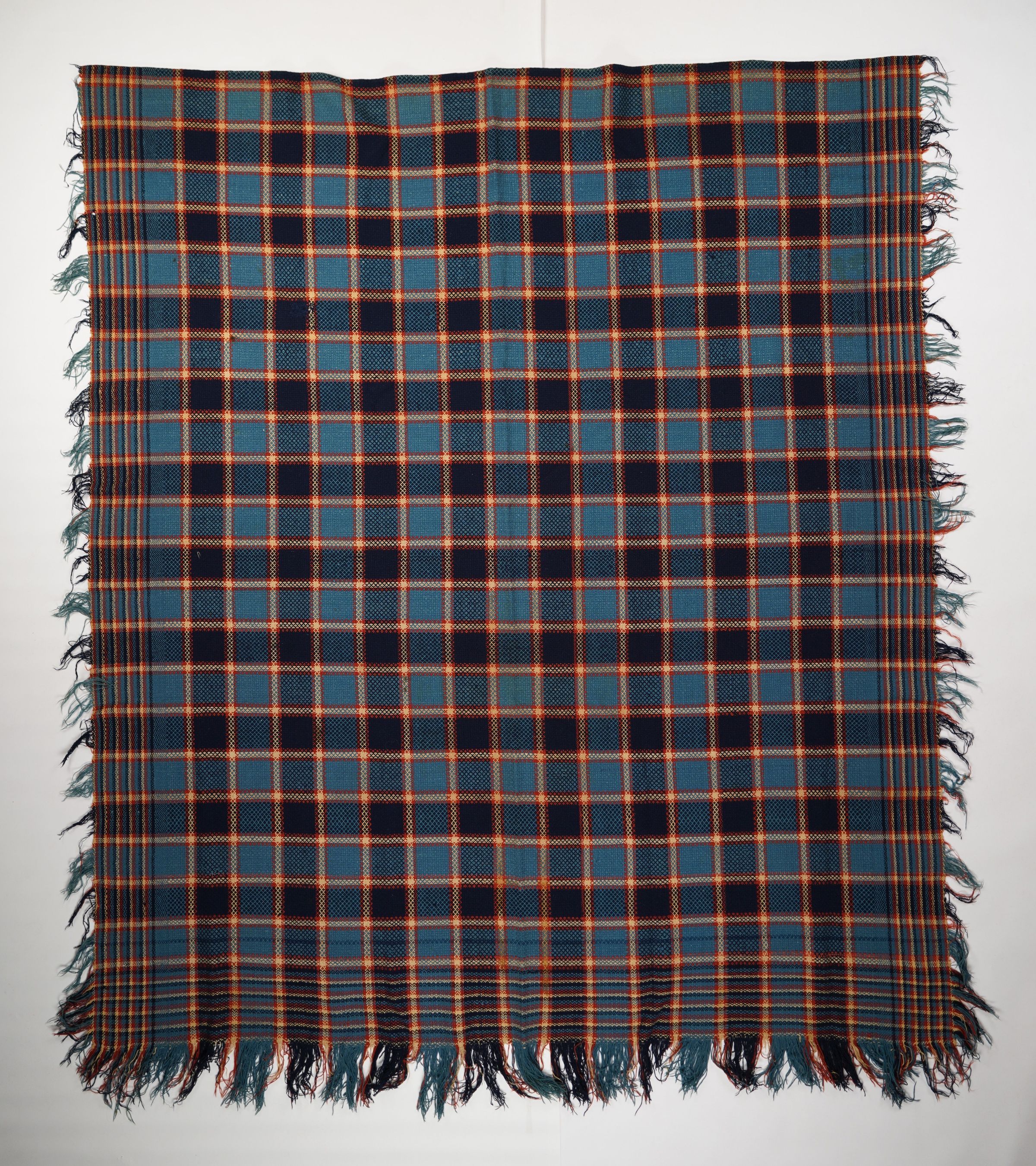 Red, blue, navy, and natural geometric bird's-eye twill coverlet with border and self-fringe on three sides. Two joined panels.Collection