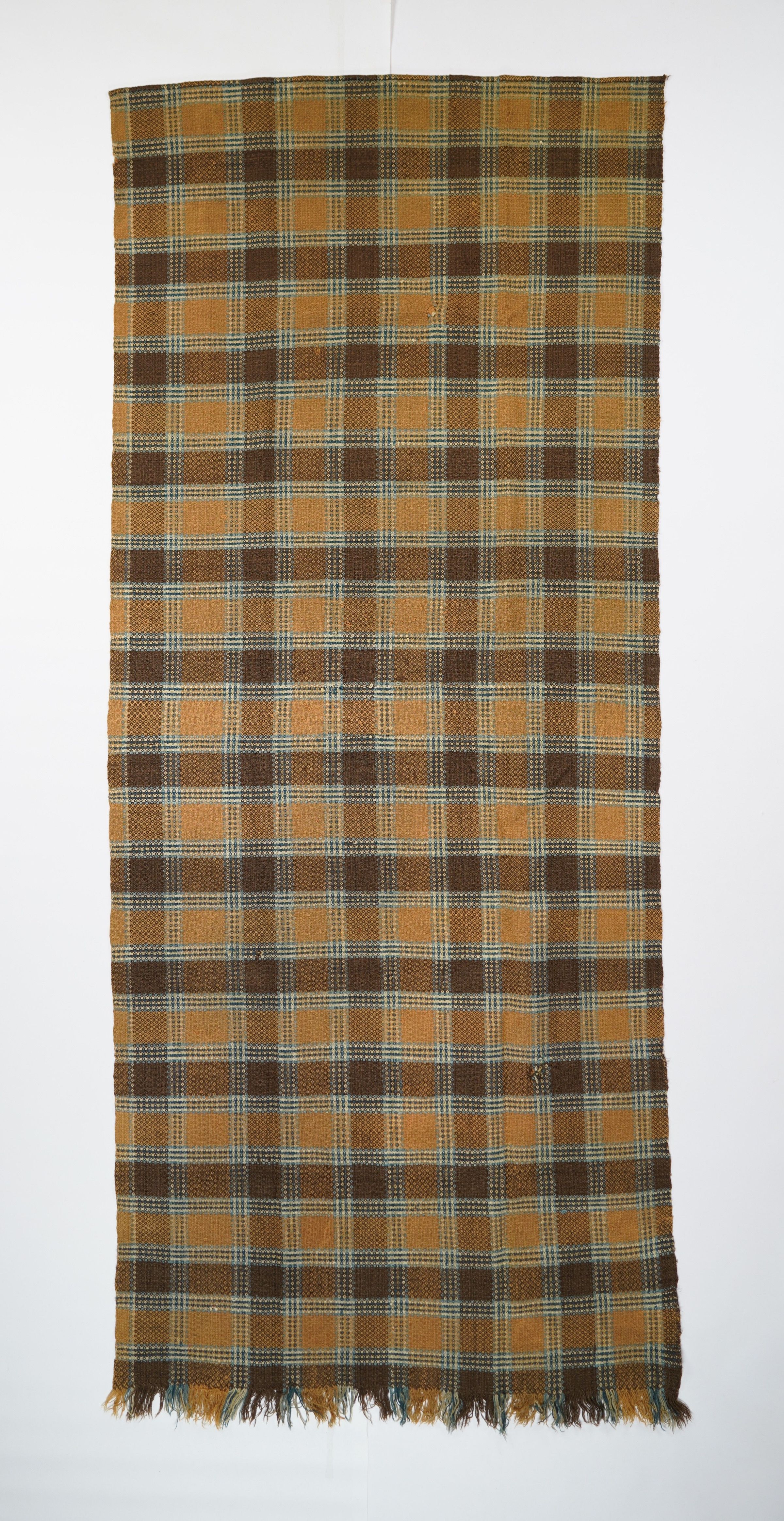 Blue, light blue, brown, yellow, and natural geometric twill coverlet with self-fringe along bottom. One panel.Collection