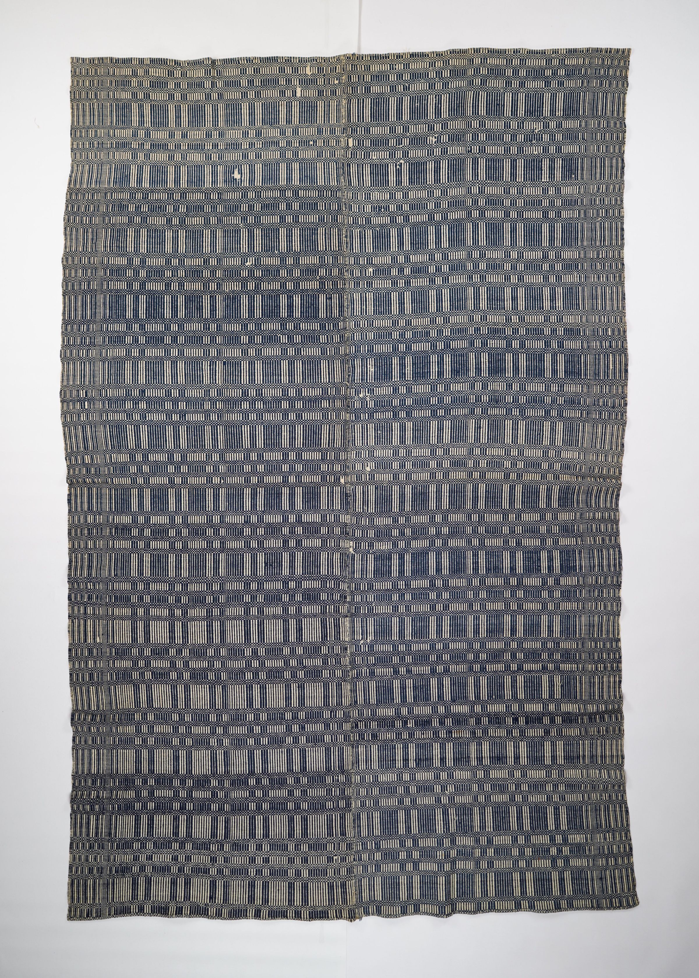 Navy and natural weft-faced coverlet with border on left and right sides. Two joined panels.