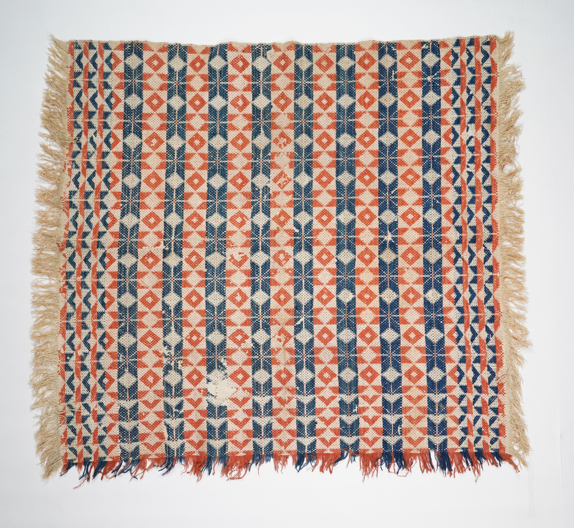 Red, navy, and natural geometric crib coverlet with border and self-fringe on three sides.