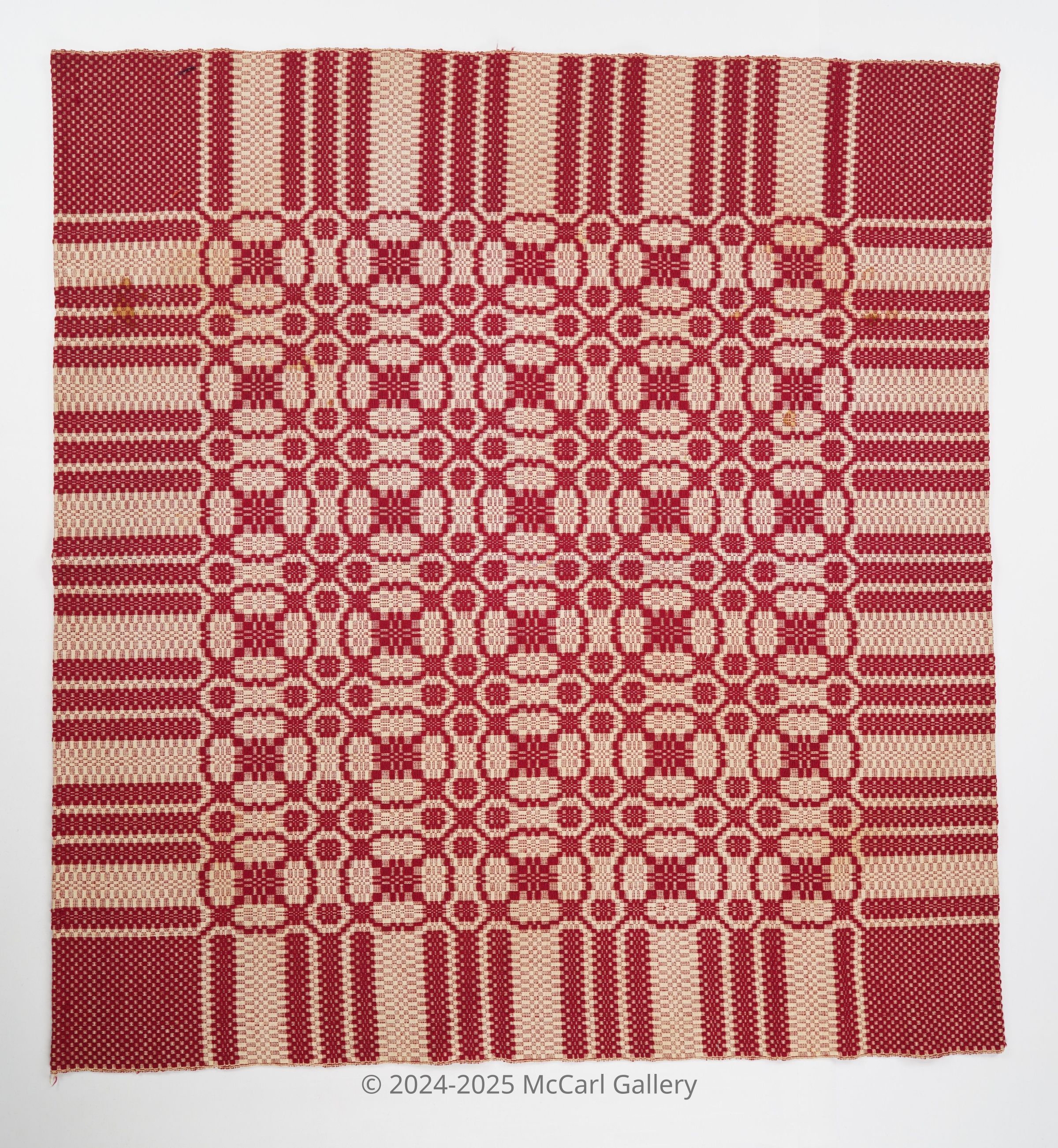 Geometric overshot coverlet with borders on 4 sides and no fringe. Woven full-width; seamless. Red wool with undyed cotton. Abstract centerfield pattern; abstract border on all sides. Unknown weaver.Collection