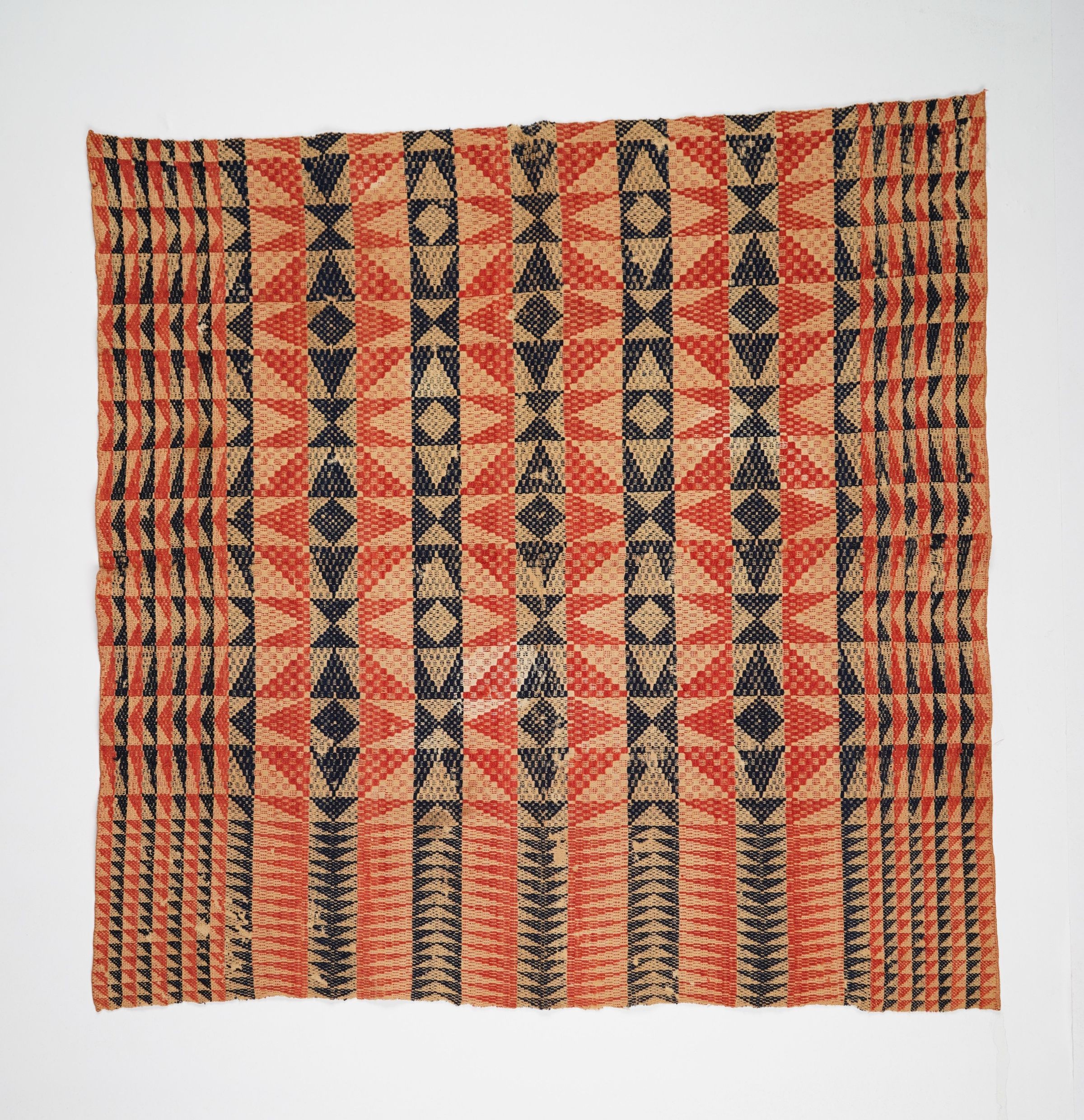 Red, navy, and natural geometric overshot crib coverlet with border on three sides.