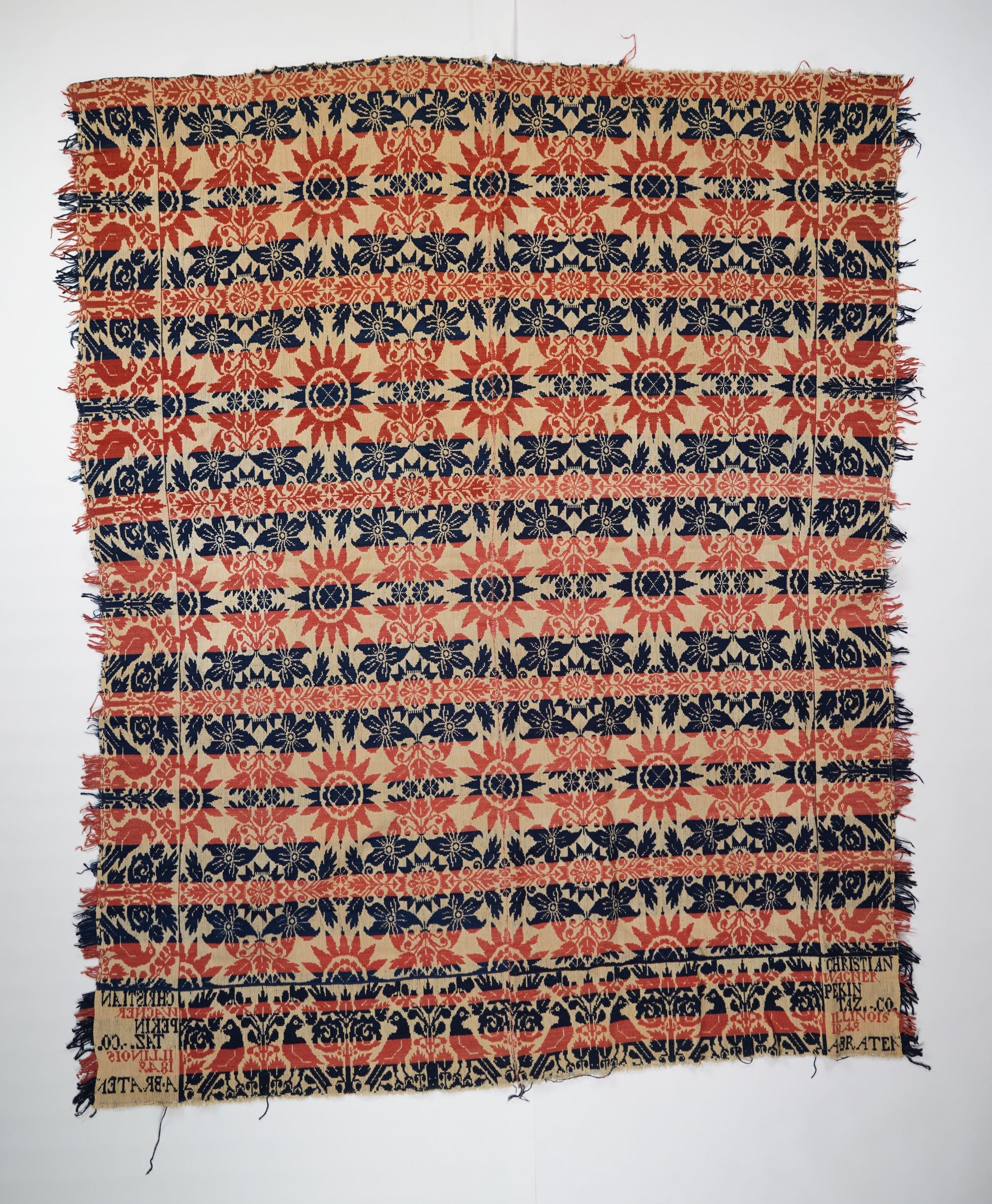 Red, navy, and natural figured tied half doublecloth coverlet with border on three sides and self-fringe on two sides. Two joined panels. Woven for Christian Wagner by August Braten in Pekin, Tazewell Co., Illinois in 1848.Collection