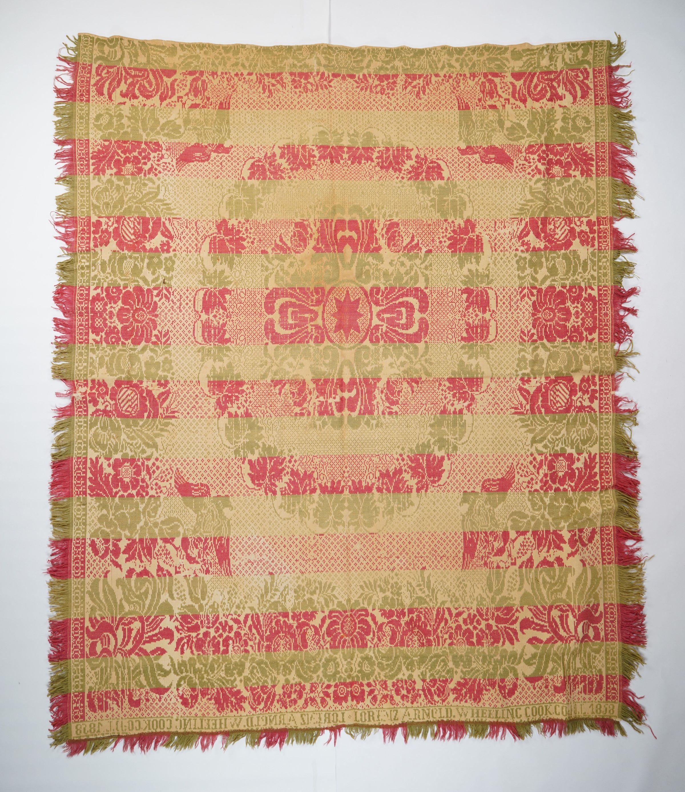 Red, green, and natural figured coverlet with border and fringe on three sides. Seamless. Woven by Lorenz Arnold in Wheeling, Cook Co., Illinois in 1858.Collection