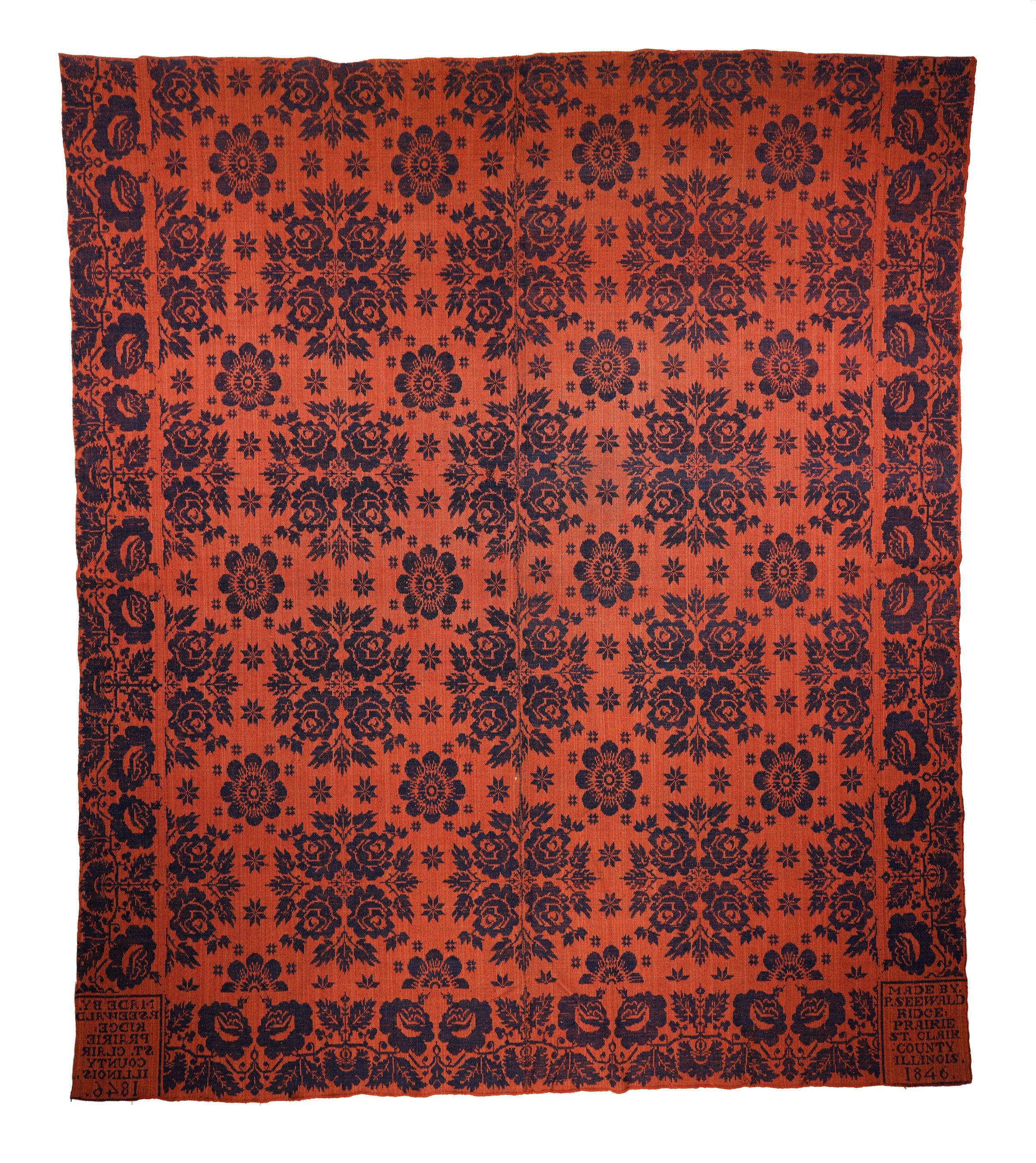 Figured and fancy tied beiderwand coverlet with borders on three sides and no fringe. Two panels joined by a center seam. Red wool warp and weft binder with blue wool pattern weft. Double roses centerfield pattern; rose border on three sides. Woven by Philip Seewald 1846 in the state of Illinois.Context