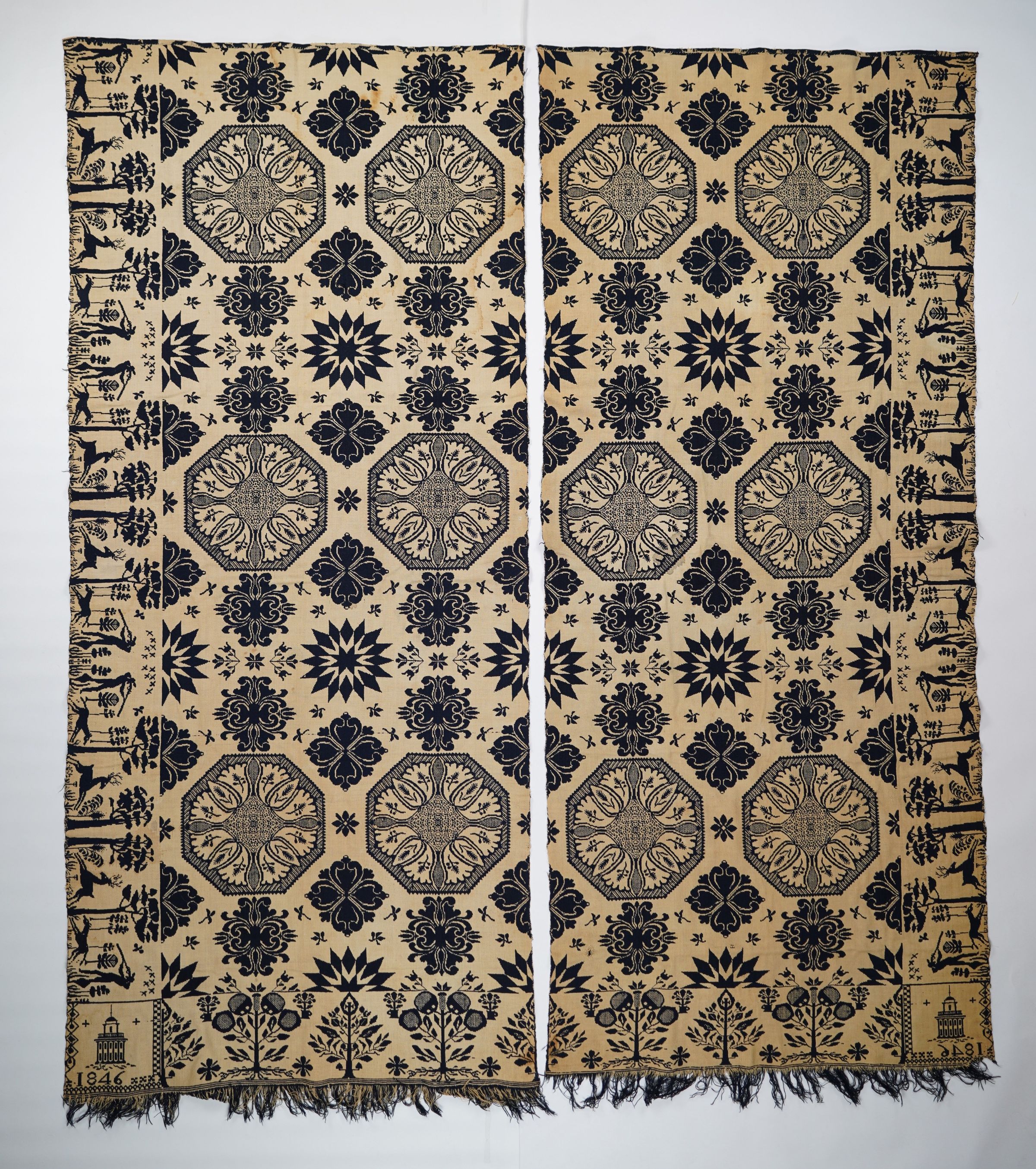 Navy and natural figured double weave coverlet with border on three sides and self-fringe along bottom. Two separated panels. Woven by Charles Adolph in Indiana based on the year and Lighthouse trademark.Collection