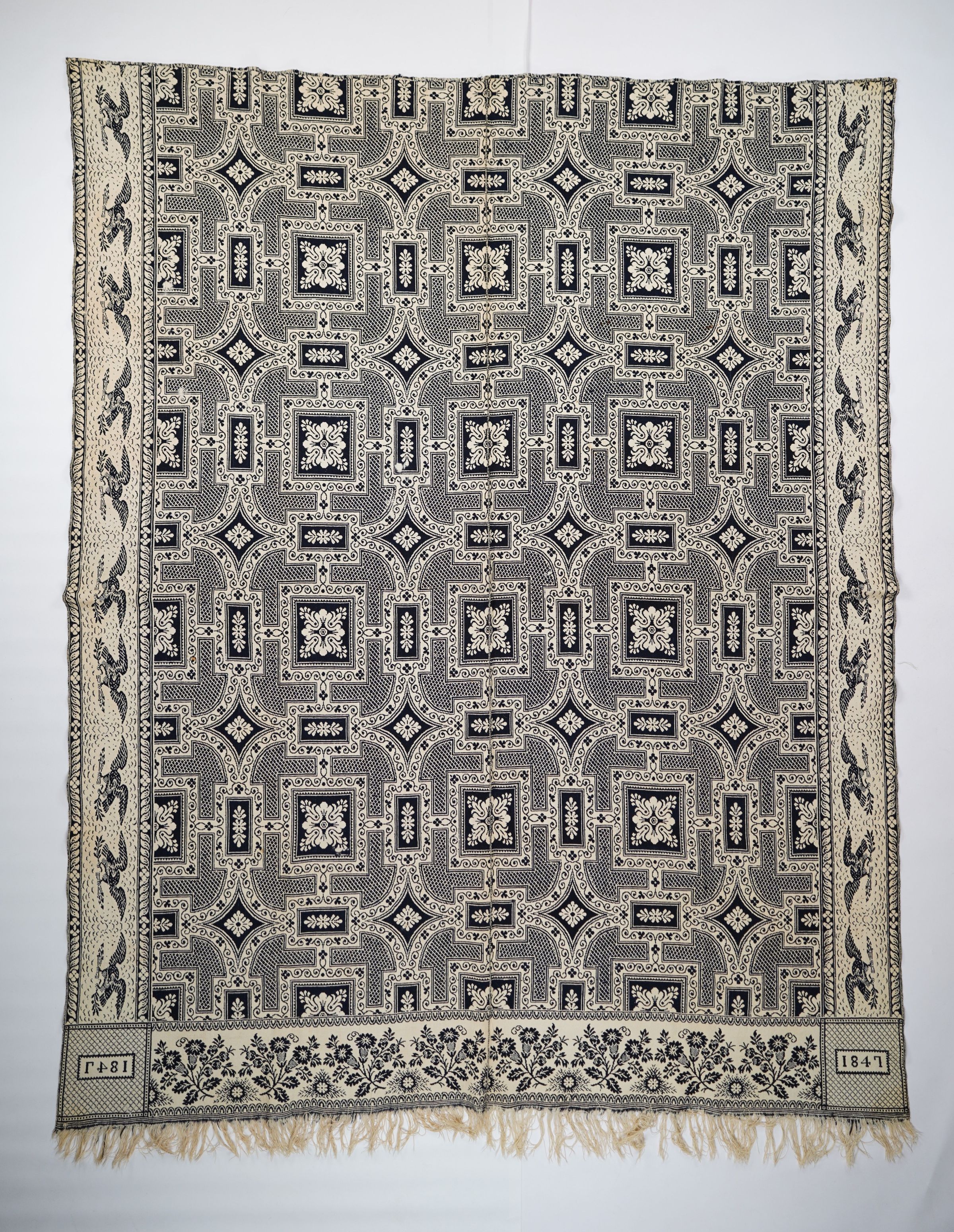 Navy and natural figured double weave coverlet with border on three sides and self-fringe along bottom. Two joined panels. Woven in Union Co., Indiana in 1847 at the Cockefair Mill based on the date in box cornerblock trademark.Collection