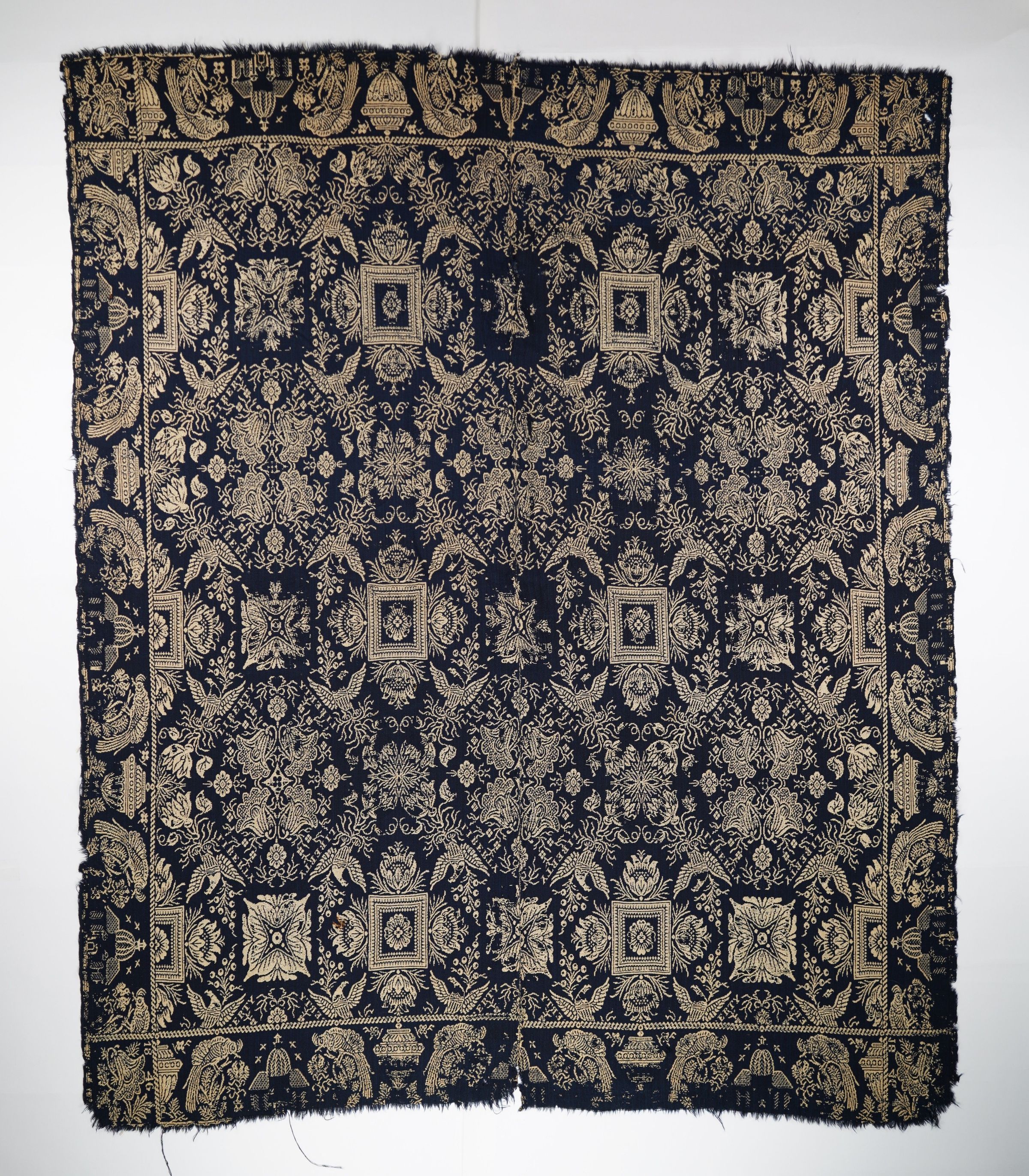 Figured and fancy doubleweave coverlet with borders on 4 sides and self-fringe on top and bottom. Two panels joined by a center seam. Navy wool with undyed cotton. Bird paradise centerfield pattern; bird border on all sides. Attributed to the Craig Family, woven in 1846.Context