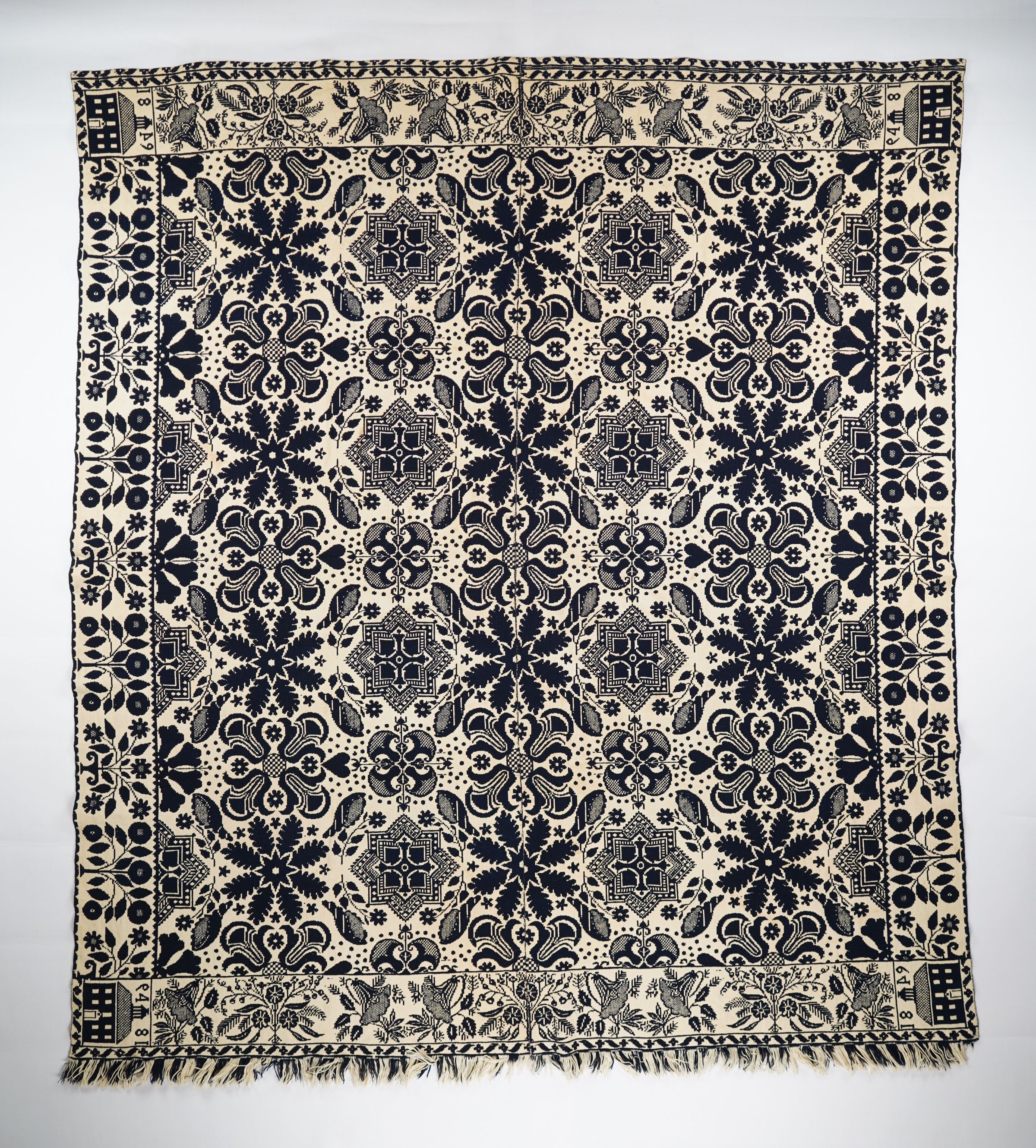 Navy and natural figured doubleweave coverlet with border on four sides and fringe along bottom. Two joined panels. Woven by the Craig Family in 1849 based on the dated courthouse trademark.Context