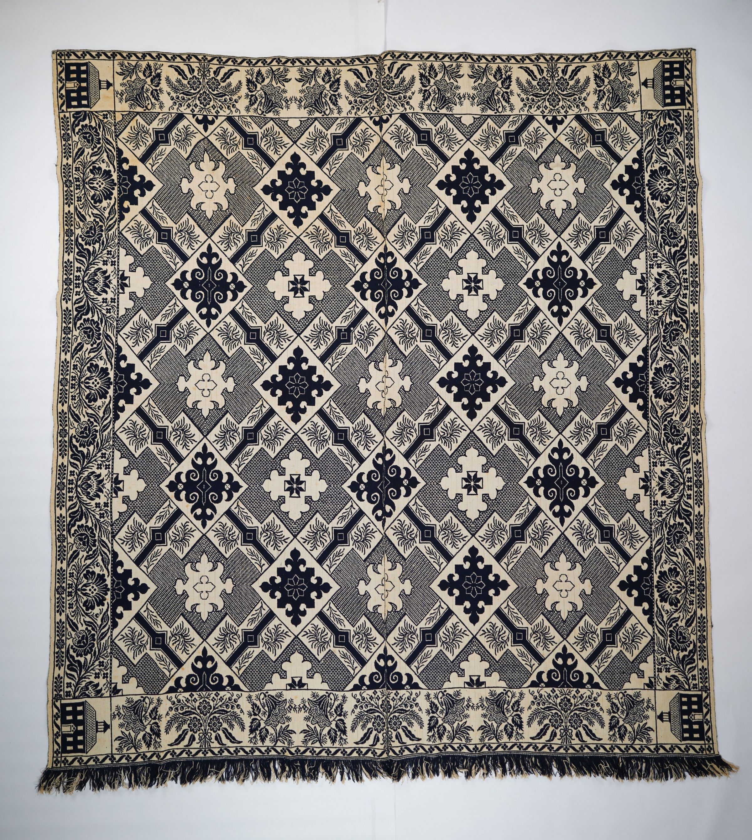 Navy and natural figured doublecloth coverlet with border on four sides and self-fringe along bottom. Two joined panels. Woven by Canada Jim or Matthew Young in Indiana based on schoolhouse/courthouse cornerblock trademark.Collection
