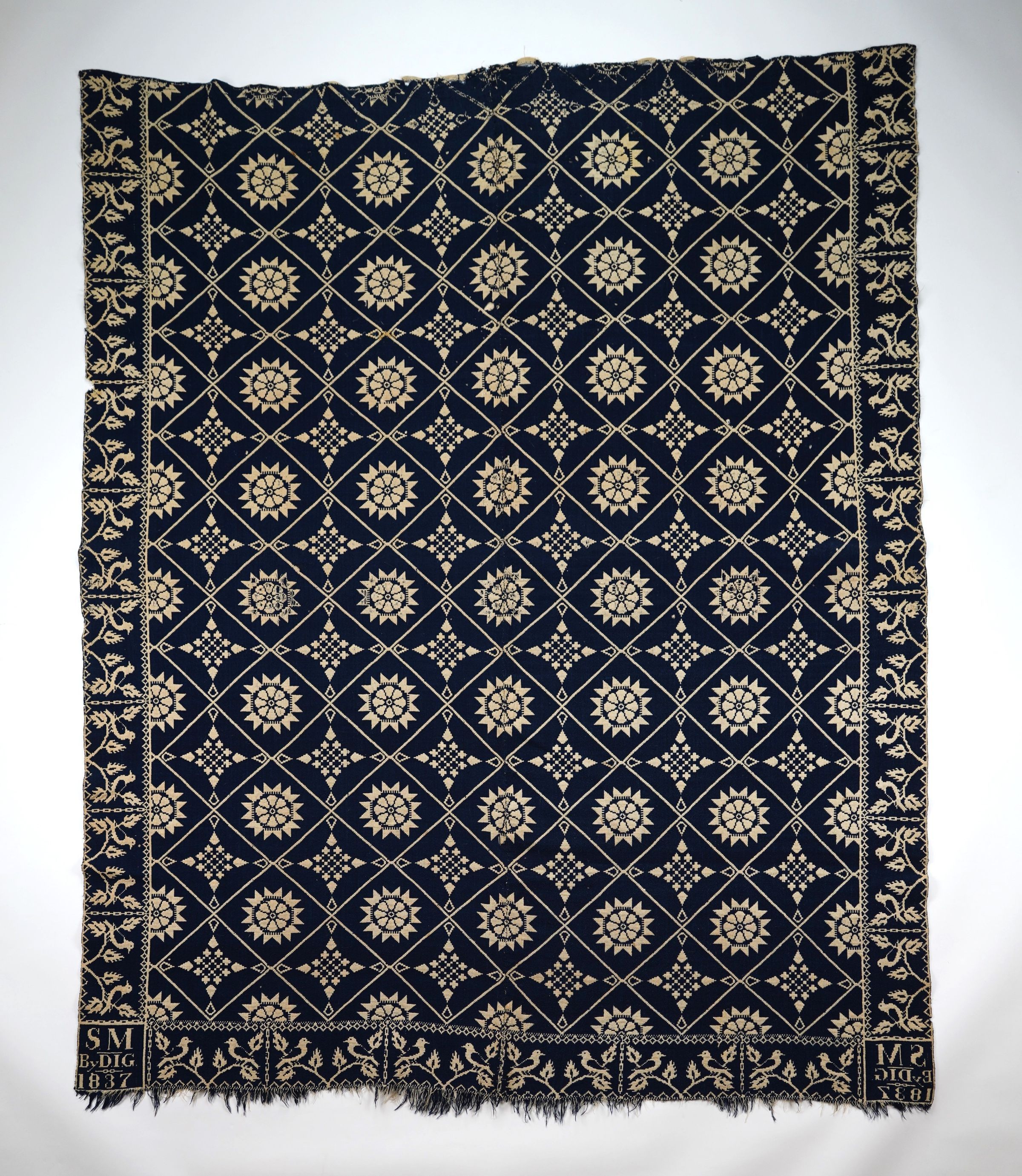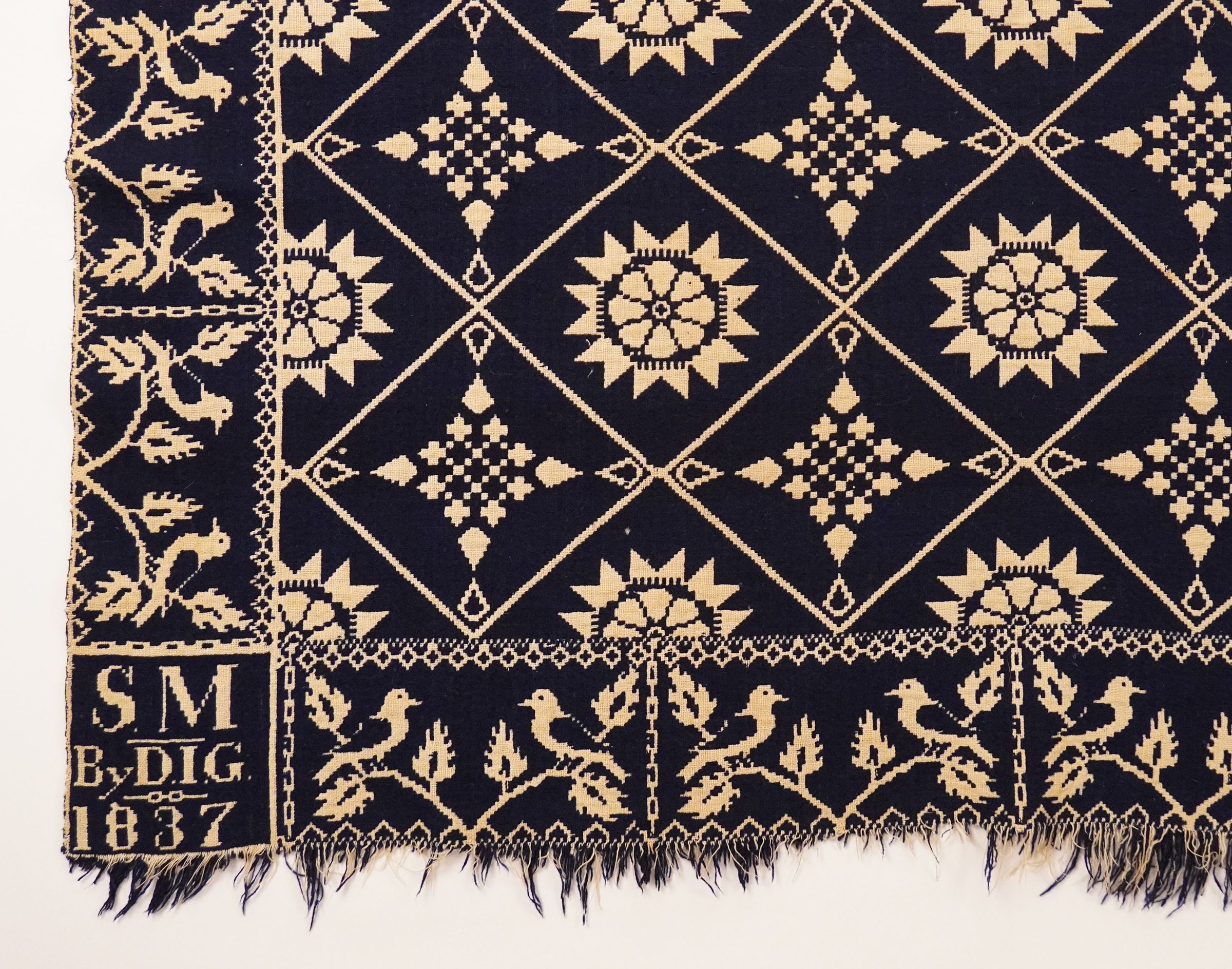 Indiana coverlet by David Isaac Grave for S.M., 1837, doubleweaveDescription