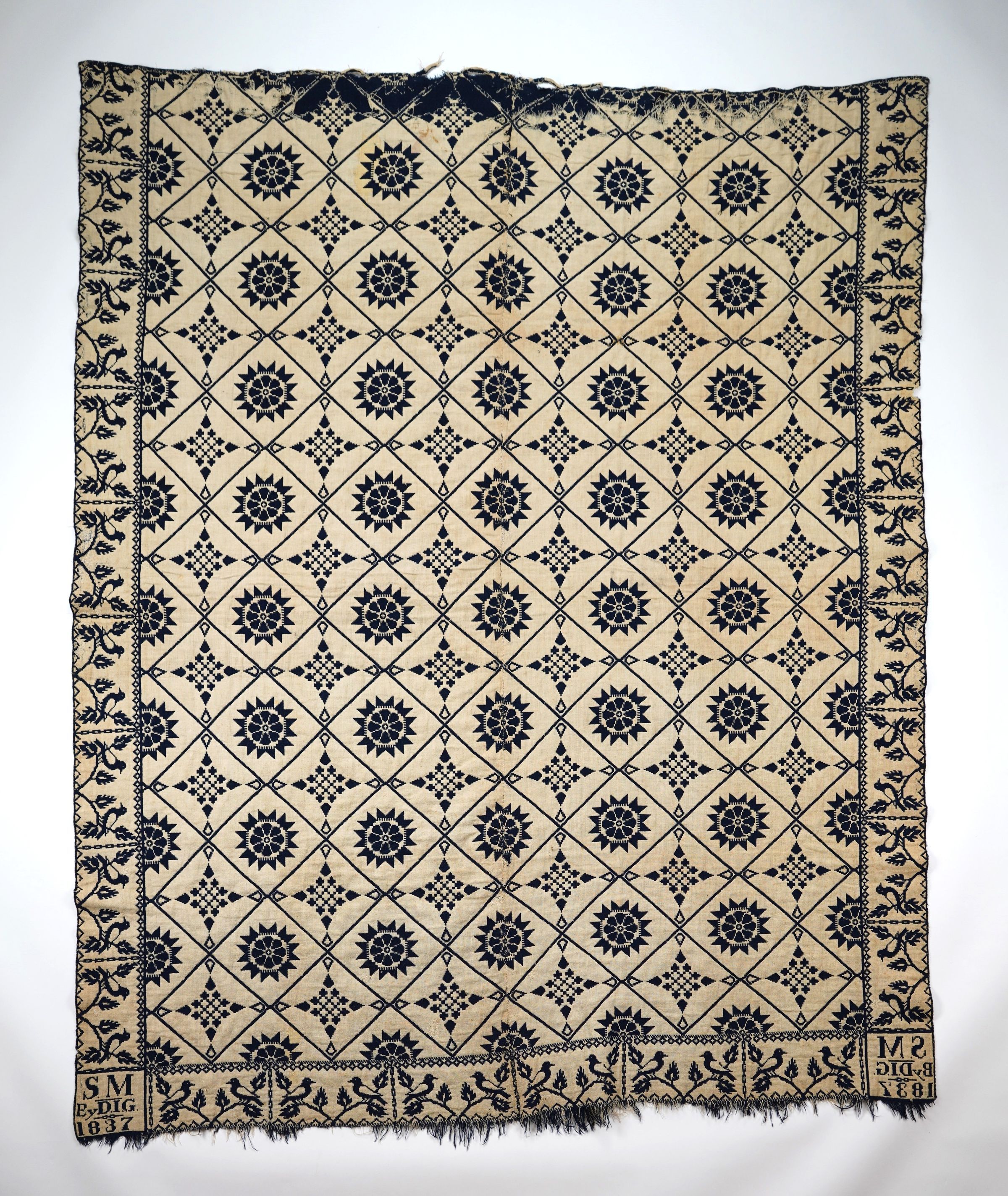 Navy and natural figured doublecloth coverlet with border on three sides and fringe on bottom edge. Two joined panels. Woven by David Isaac Grave for S.M. in Indiana in 1837.Collection