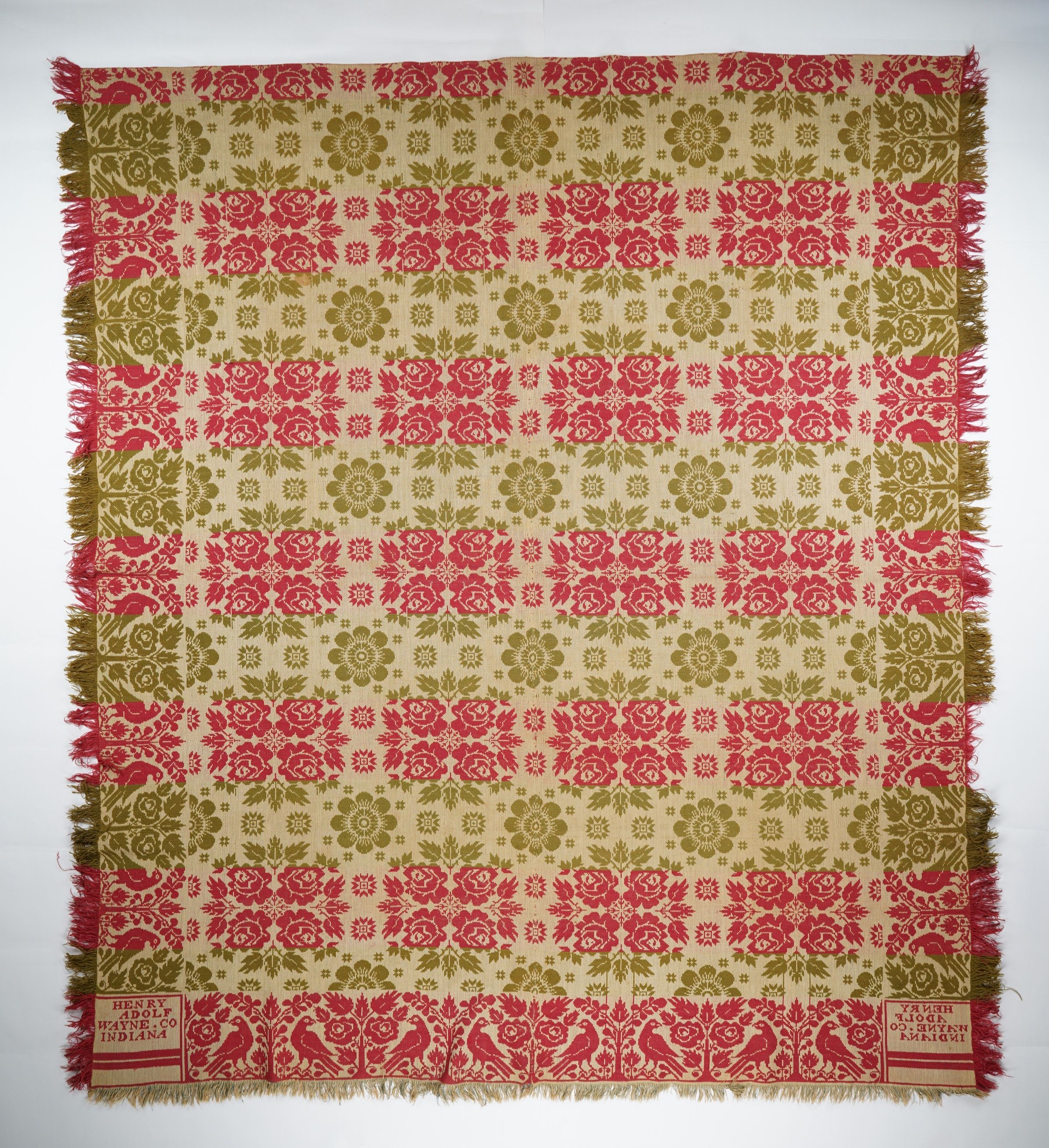 Green, red, light blue, and natural figured tied beiderwand coverlet with border and self-fringe on three sides. Two joined panels. Woven by Henry Adolf in Wayne Co., Indiana.Context