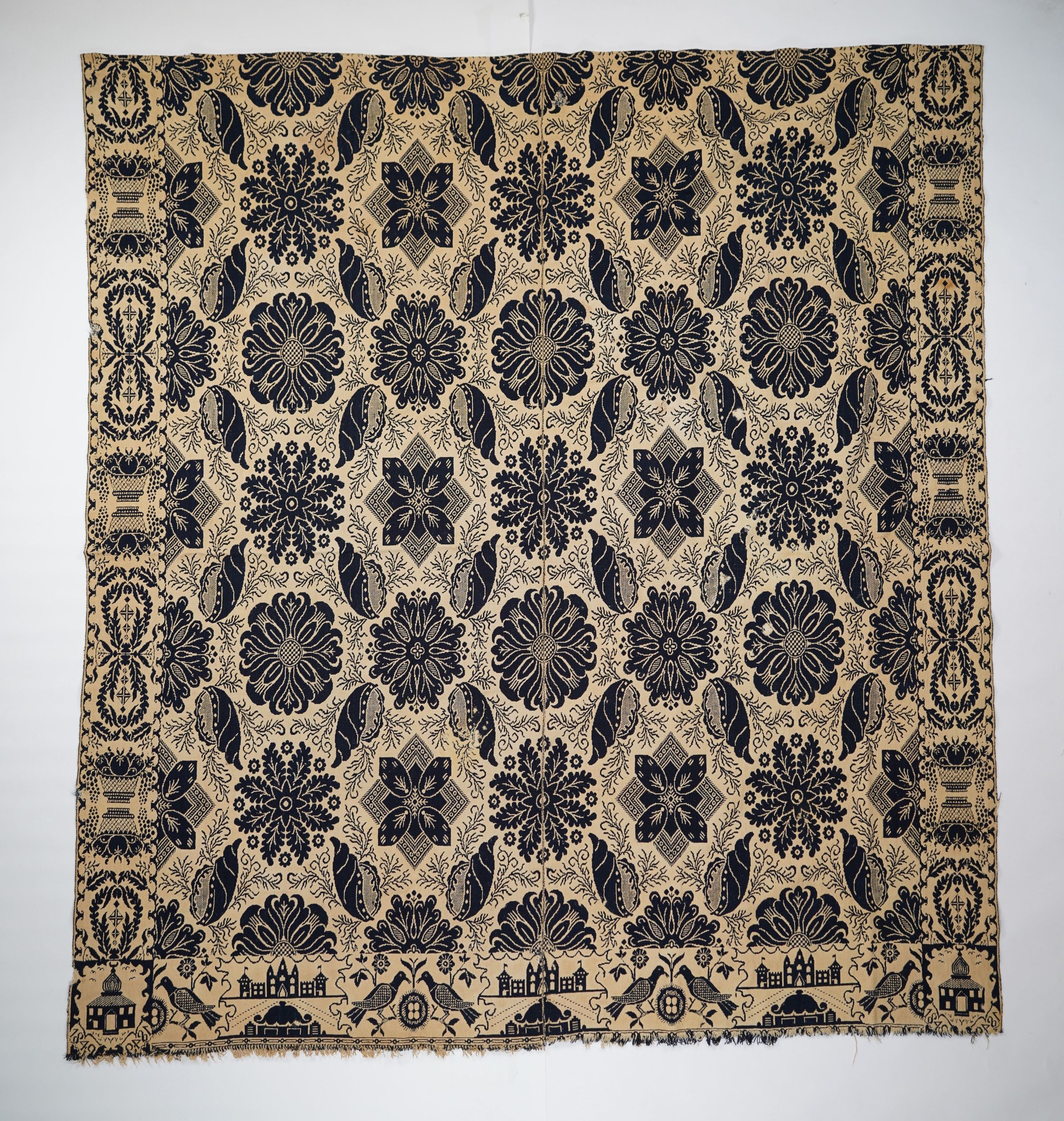 Navy and natural figured doublecloth coverlet with border on three sides and self-fringe along bottom. Two joined panels. Woven by John or William (Sr.) Craig in Indiana in 1849 based on the cornerblock trademarkCollection