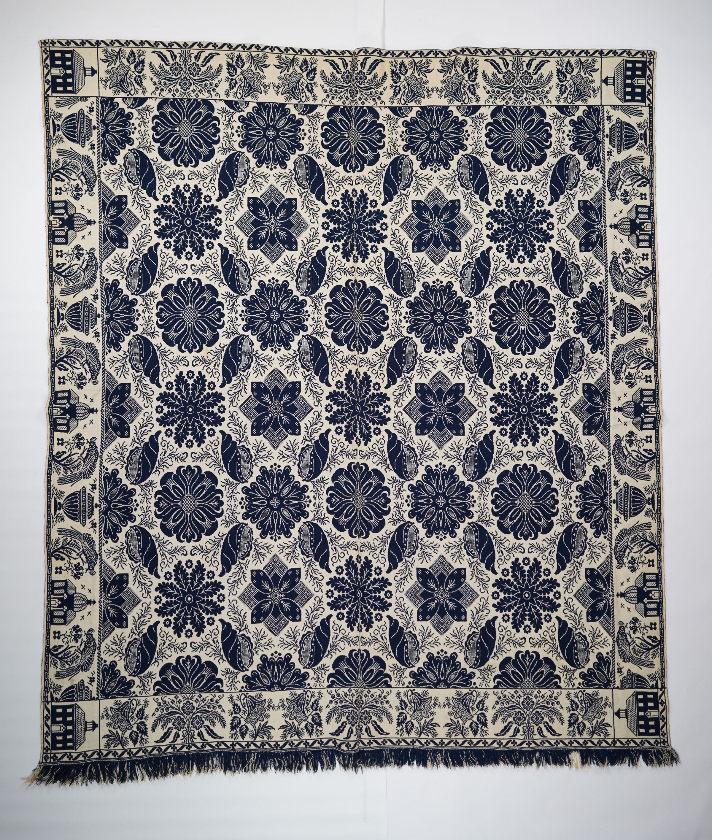 Figured and fancy doubleweave coverlet with borders on four sides and self-fringe on bottom. Two panels joined by a center seam. Navy blue wool with natural cotton. Shells and medallions in centerfield pattern; birds and urns with domed building in side borders; floral border on bottom with catalpa flowers. Woven by James "Canada Jim" Craig or Matthew Young, who used this undated building logo.Collection