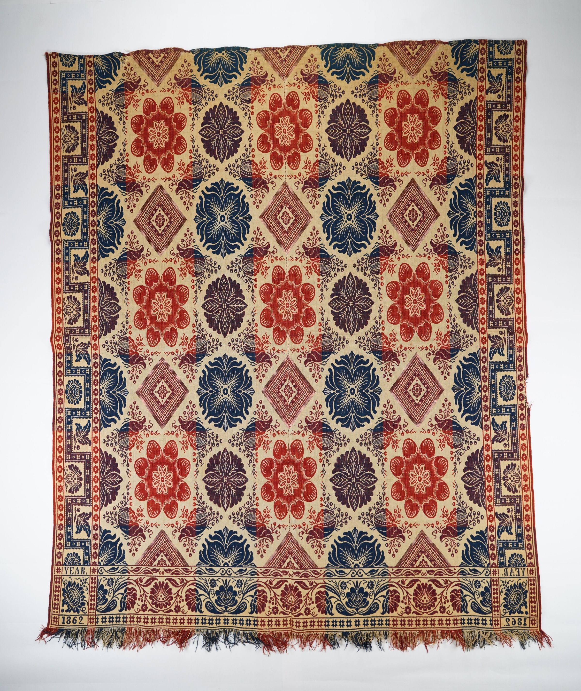 Red, navy, and natural figured doubleweave coverlet with border on three sides and self-fringe along bottom. Two joined panels. Woven by Henry or Sarah LaTourette in Covington, Fountain Co., Indiana in 1862, based on the "YEAR" Floral trademark.Context