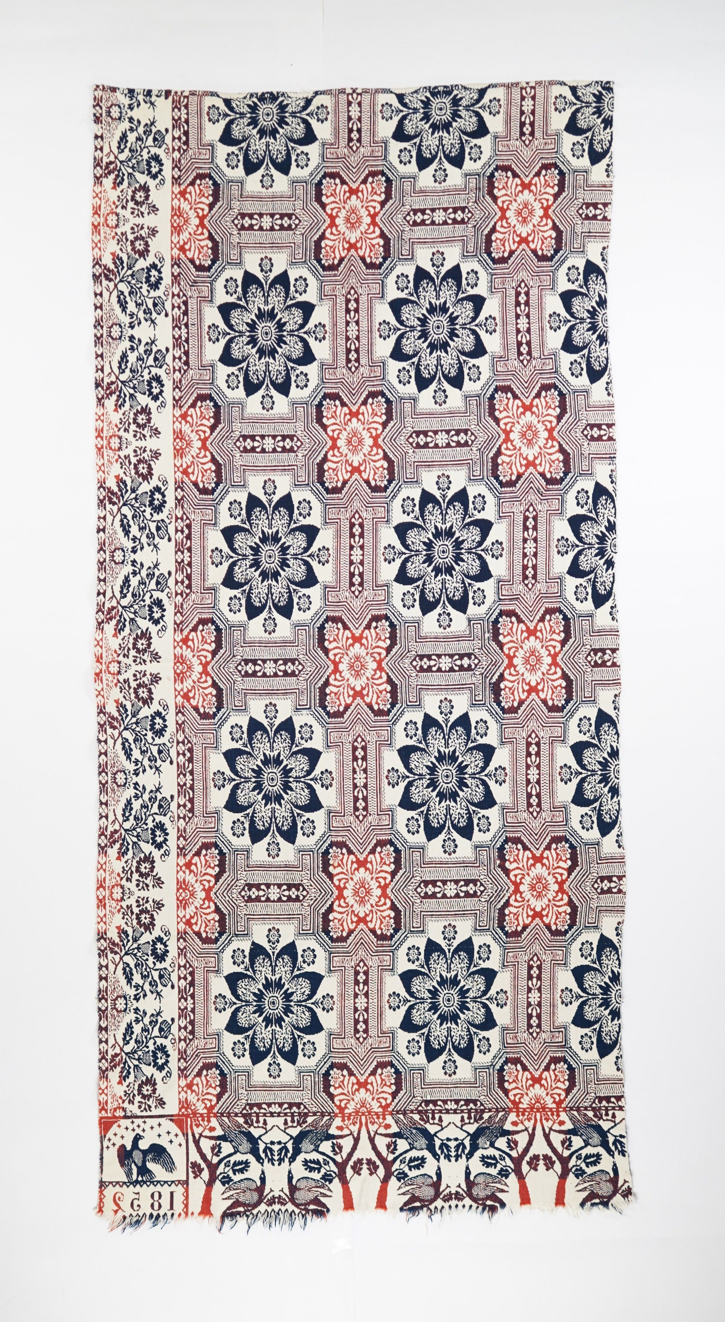 Figured and fancy doubleweave coverlet panel with borders on side and bottom and self-fringe on bottom. Single panel. Navy and red wool with undyed cotton. Floral mosaic centerfield pattern; floral border on side; passenger pigeon border on bottom also known as "lovebirds" or "kissing birds." Woven by Matthew Rattray in 1852 with eagle trademark cornerblock.Context